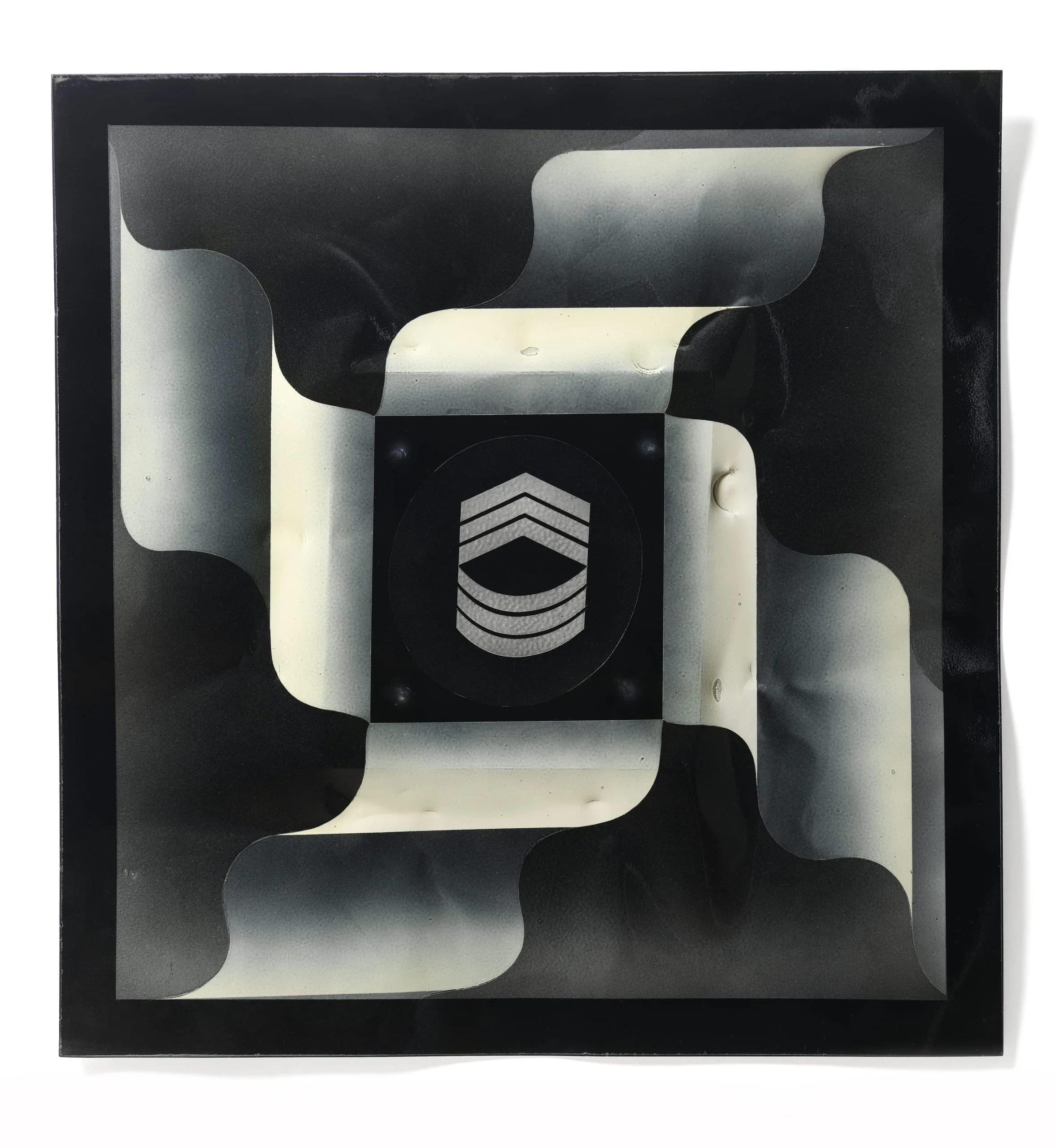 Billy Al Bengston’s years as a professional motorcycle racer profoundly affected his art practice. He excelled at painting bikes, and particularly enjoyed spraying multiple layers of automotive lacquer on their hard metal surfaces. This experience inspired his subsequent work: in 1965 Bengston began denting, hammering, folding, crumpling, and even puncturing aluminum sheets and then spray-painting them, creating a series referred to as “dentos.” Among these is Tom, whose many layers of lacquer suggest dizzying spatial depths, while its high-gloss finish immediately brings the viewer's eye back to the surface.
