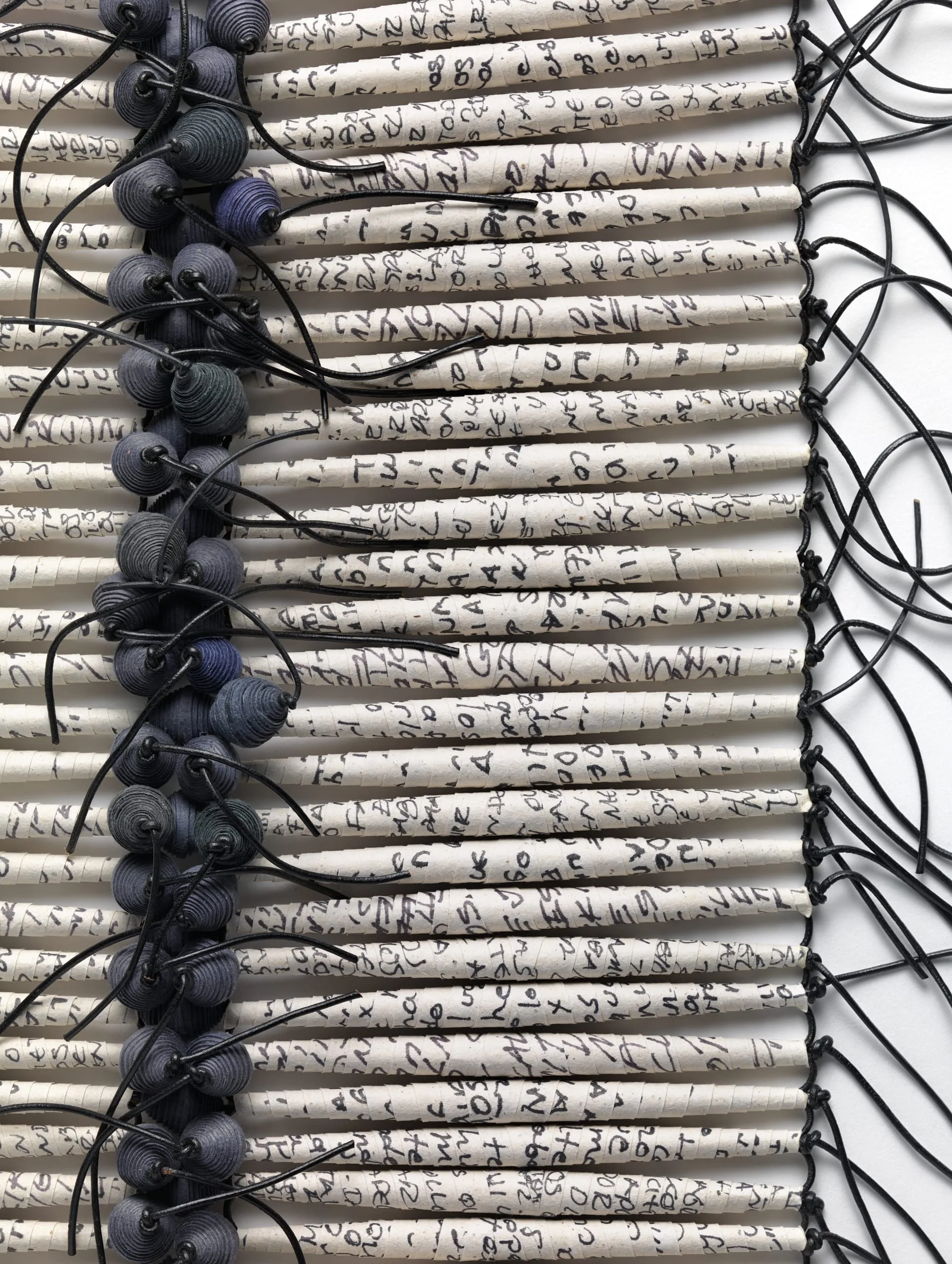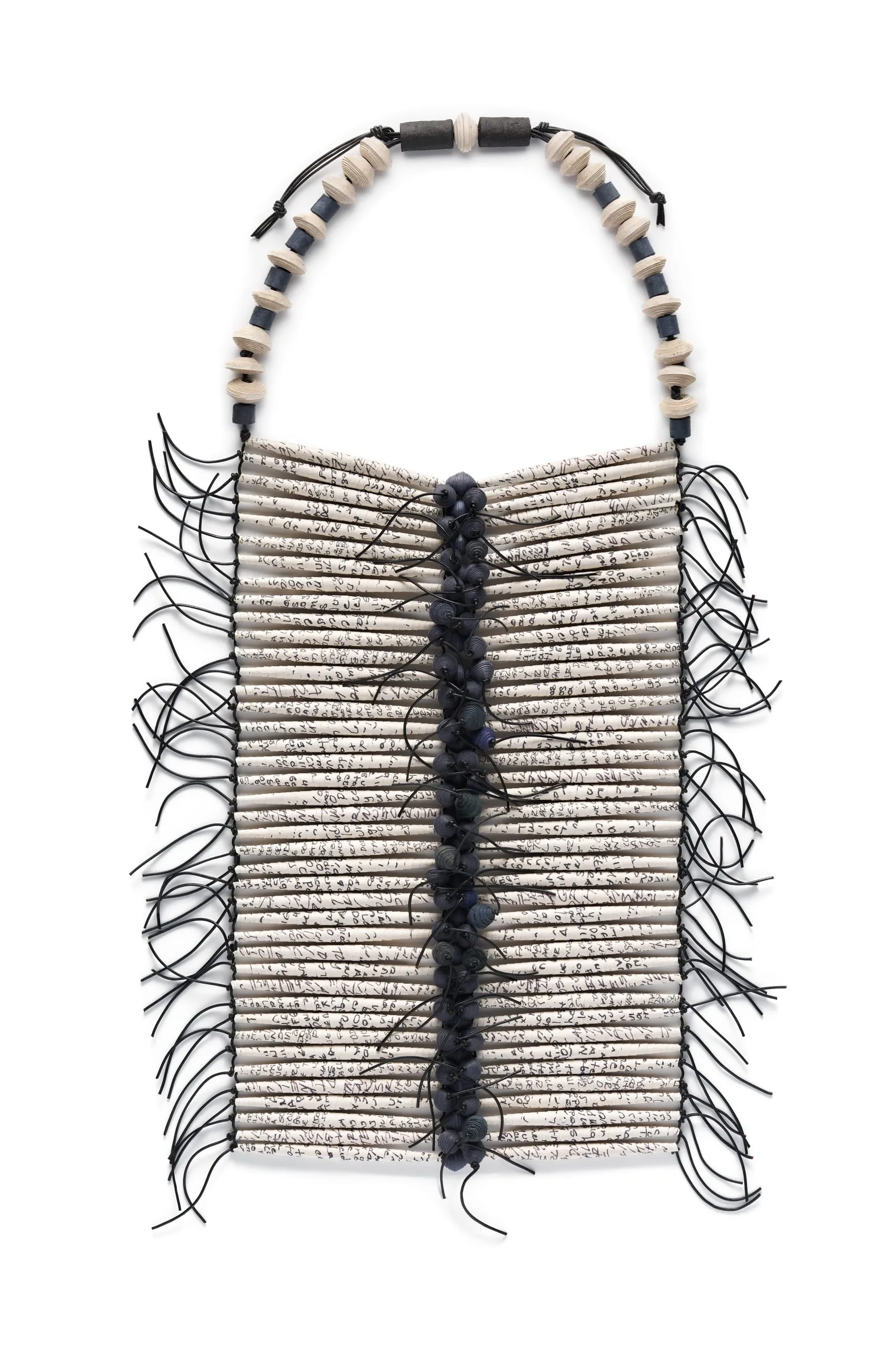 Milagros #1 is a breastplate, a format in which Slemmons has often worked. It is also influenced by imagery of Mexican calaveras and skeletons used during Día de los Muertos celebrations. Slemmons asked each artisan to write ten wishes on taller paper that was rolled into the bone-like beads and assembled. Milagros (translated as "miracles") are small religious folk charms worn to bring healing and good luck. They are the physical manifestation of a wish or prayer. The piece thus contains Slemmons’ wishes together with those of her local collaborators.