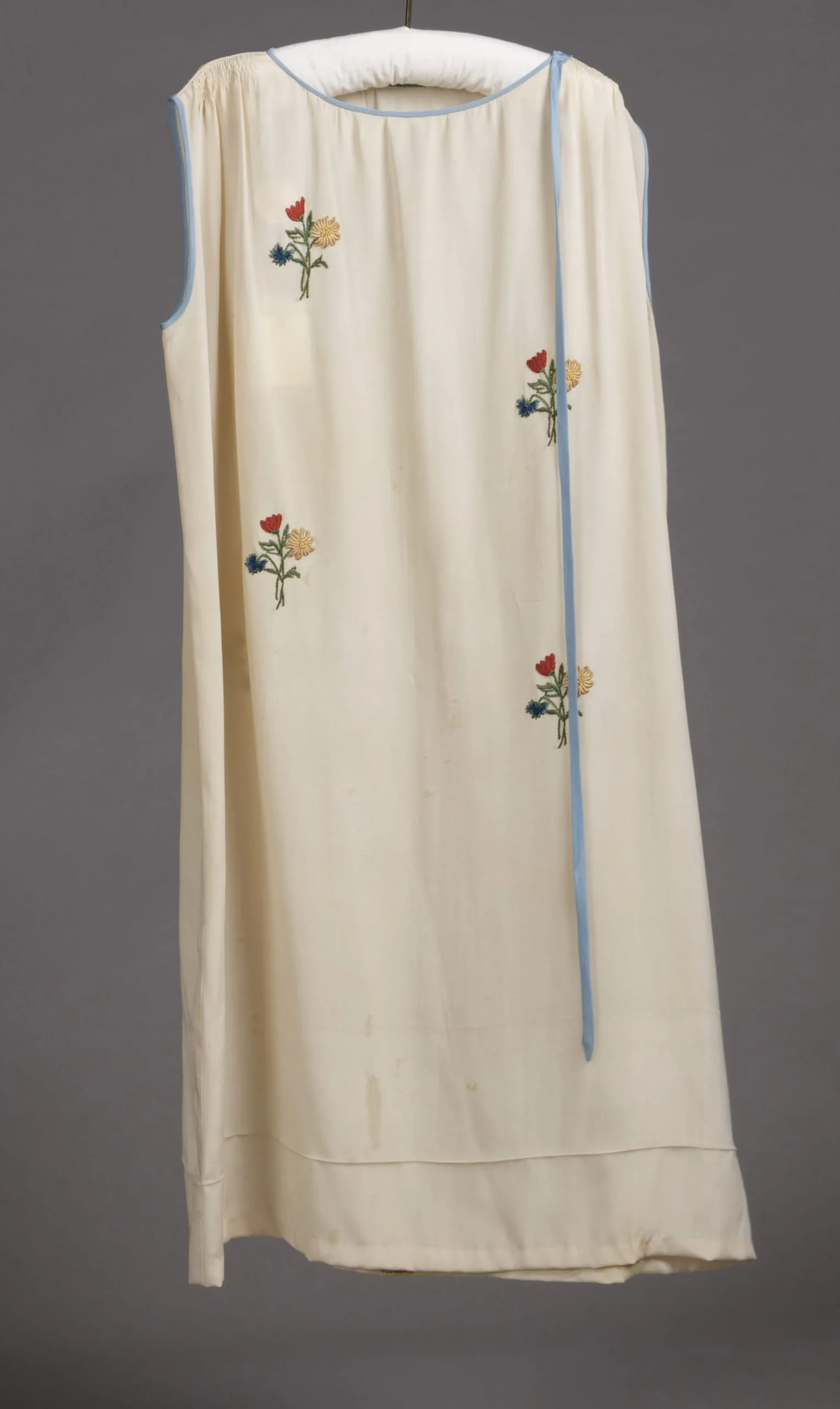 Cream sleeveless dress on a hanger, with pale blue neckline trim and a hanging ribbon, decorated with four scattered embroidered floral bouquets in red, blue, and yellow