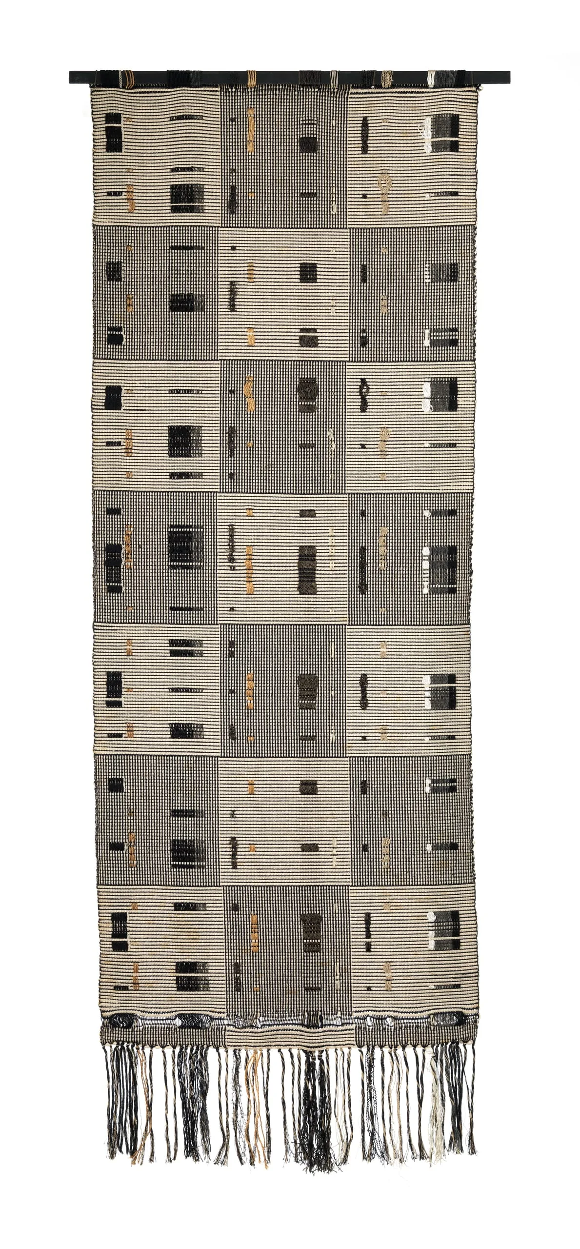 Kay Sekimachi is a towering figure of California fiber, a master of both traditional weaving techniques and experimental fiber constructions. Born in San Francisco to Japanese immigrants, Sekimachi and her family were sent to internment camps during World War II. After the war, Sekimachi studied weaving with Trude Guermonprez, who taught experimental techniques and complex structures such as double weaves. Guermonprez had studied weaving in Germany with several Bauhaus alumni and brought that influence to California when she moved to the state in 1949. This 1959 neutrally-toned wall hanging is Sekimachi’s most sophisticated geometric design from the 1950s, her first decade of weaving. Sekimachi recalls that its composition was inspired by the paintings of Piet Mondrian, but it also resembles the skillful interlocking designs of other Bauhaus weavers such as Gunta Stölzl, Benita Otte, and Anni Albers, whose work Sekimachi may have known through Guermonprez. Sekimachi used the warp brocade technique, adding supplemental warps to create the complex geometries.