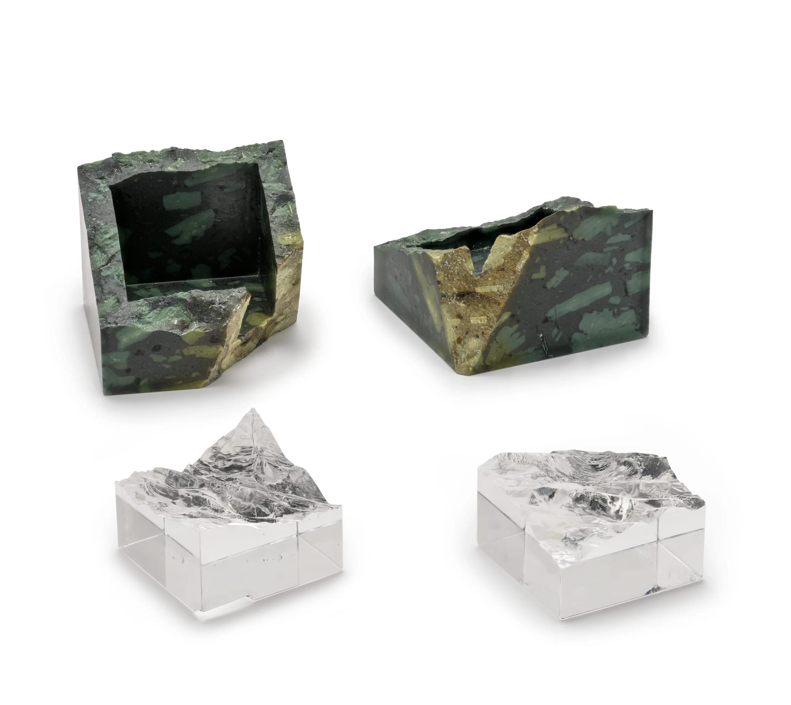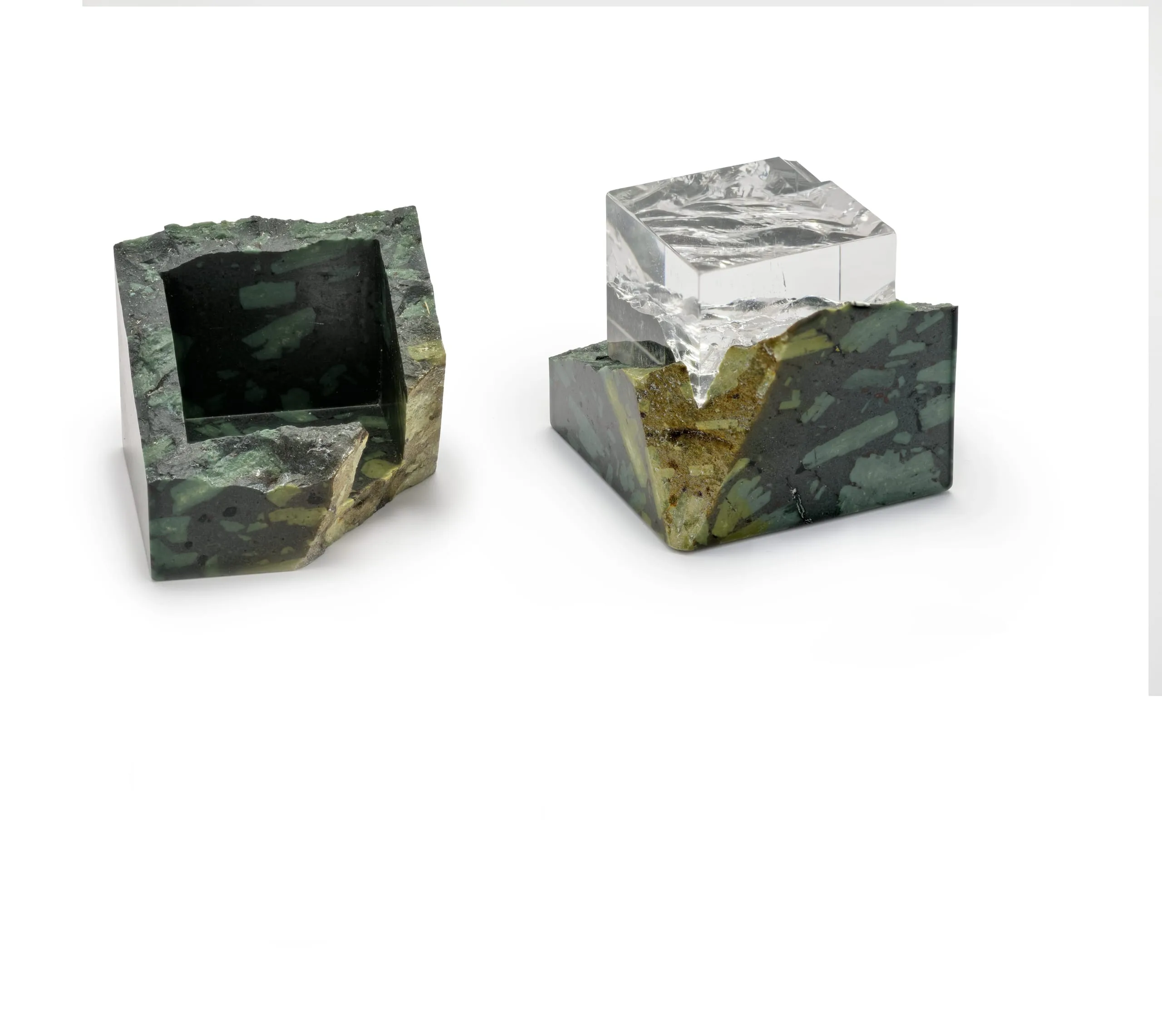 Extraordinarily durable and extremely difficult to shape, highly polished semi-precious hardstones are uniquely suited for creating long-lasting, lustrous works of technical virtuosity. This intricate example of Ben Gaskell’s obsession with the medium’s physical properties illuminates the delights and challenges of working such tough materials. Gaskell has been enchanted with stone carving since childhood. With ten years of experience trading rock crystal in Madagascar, he is an expert at trimming and splitting. He achieved the rock crystal's exceedingly tricky, ripple fracture by applying immense force at just the right angle. Carved and polished into a perfect cube, the crystal’s geometry contrasts with the light-catching undulations of this shockwave-like split. The green porphyry container is carved with equal attention and precision. Revealing the crystal inside, its lopped corner coincides precisely with a shift in the stone’s coloration from green to yellow. When open, the almost imperceptible hairline break that separates the box from its lid appears as if it has been ruthlessly smashed open. This dramatic detail, highlighting stone’s vulnerability to this type of breakage, was inspired by looting damage wrought to sarcophagi that would otherwise have protected their occupants for eternity.