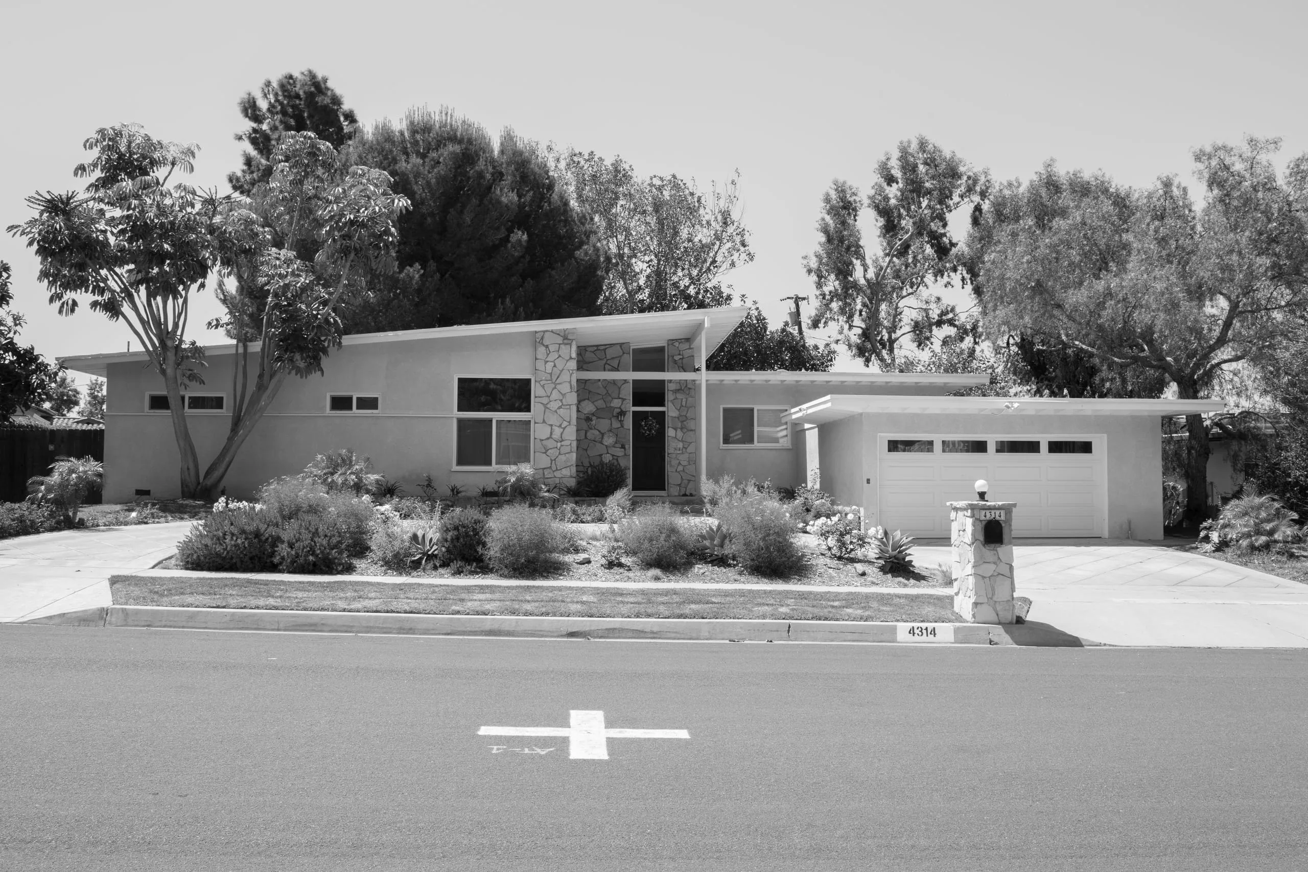 Black and white photograph of a single-story mid-century modern house with flat roofline, stone-clad entrance column, two-car garage, and xeriscape front garden; street number 4314 visible at curb