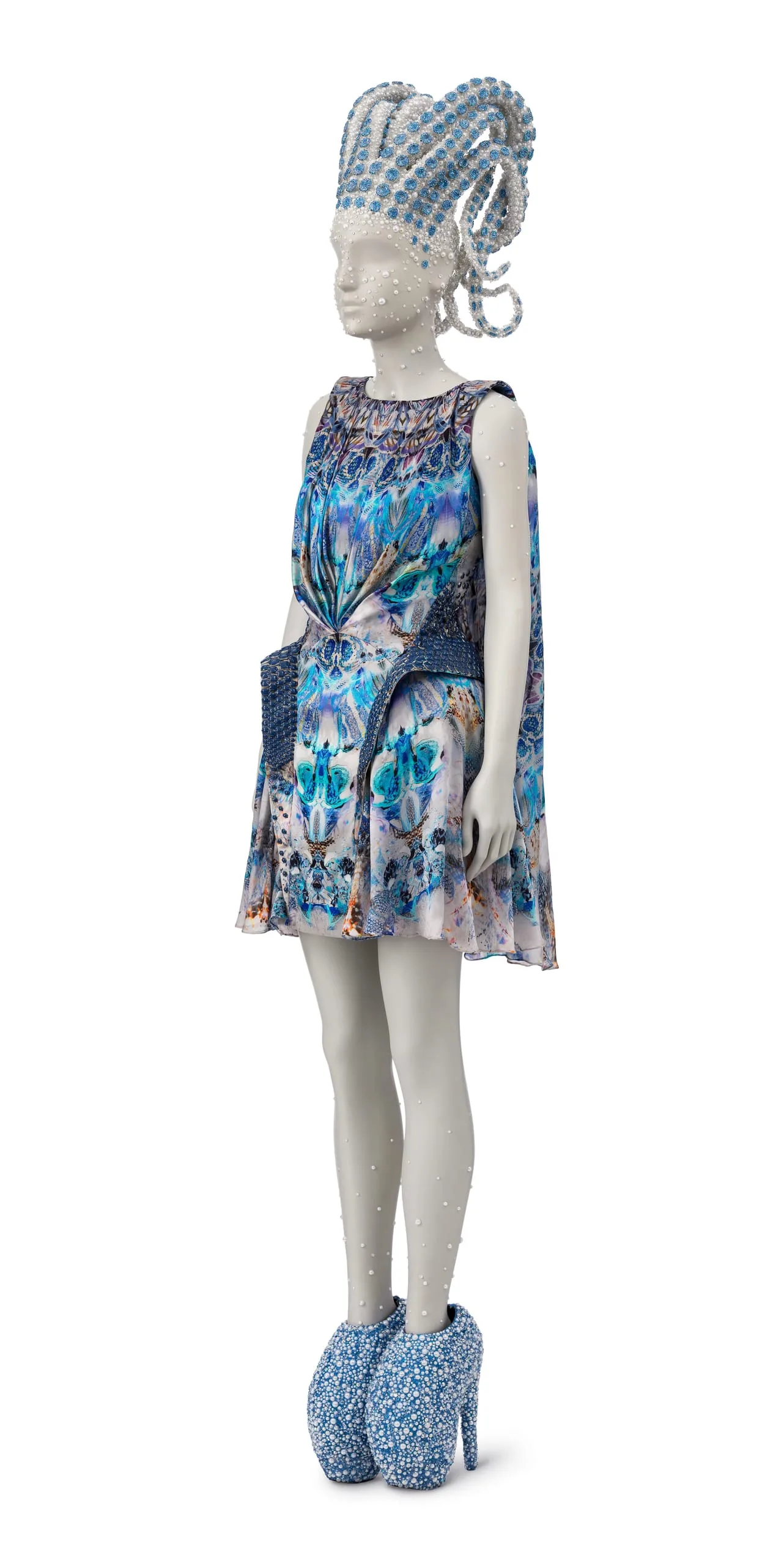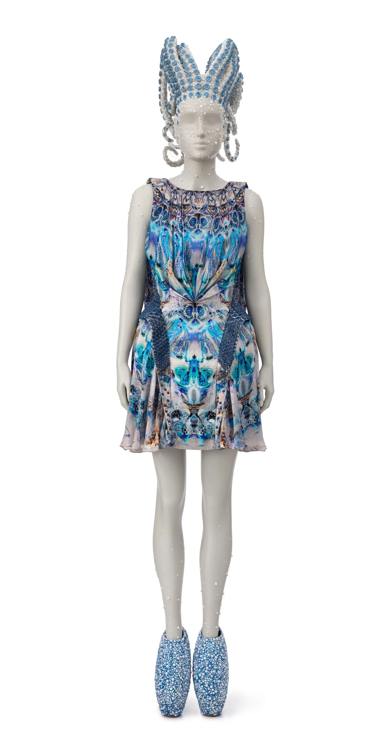 - Silk satin, digitally printed, and silk plain weave (chiffon), digitally printed, with metal enameled beads