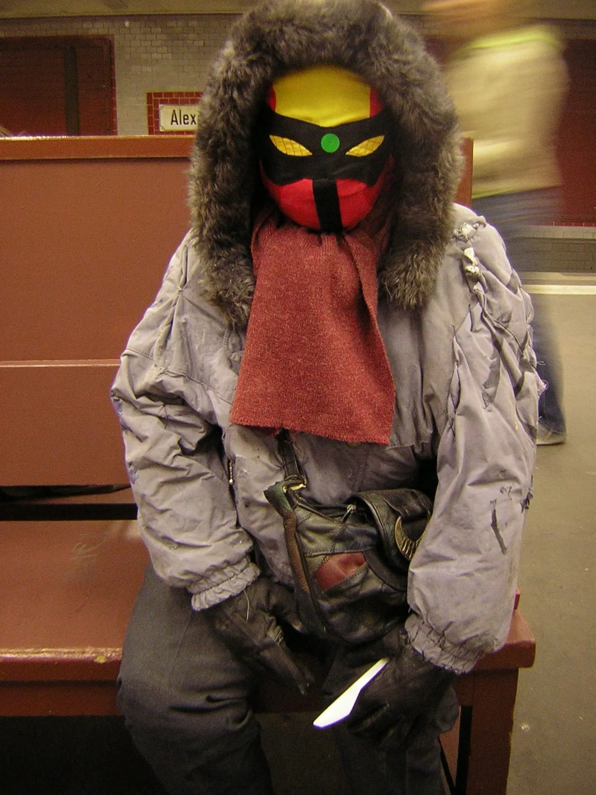 Color photograph of a masked figure seated on a subway bench wearing a silver puffer jacket, fur-trimmed hood, and a painted yellow, black, and red face mask