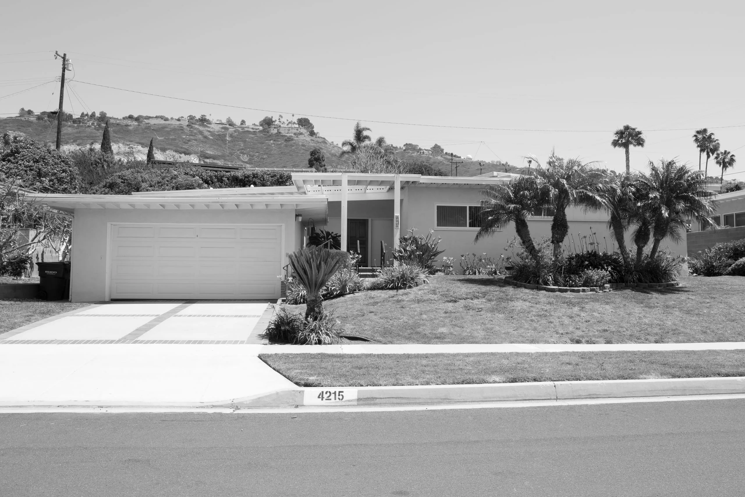 Black and white photograph of a single-story mid-century modern house with a flat roof overhang, two-car garage, concrete driveway, manicured lawn, and palm trees, street number 4215 visible at the curb