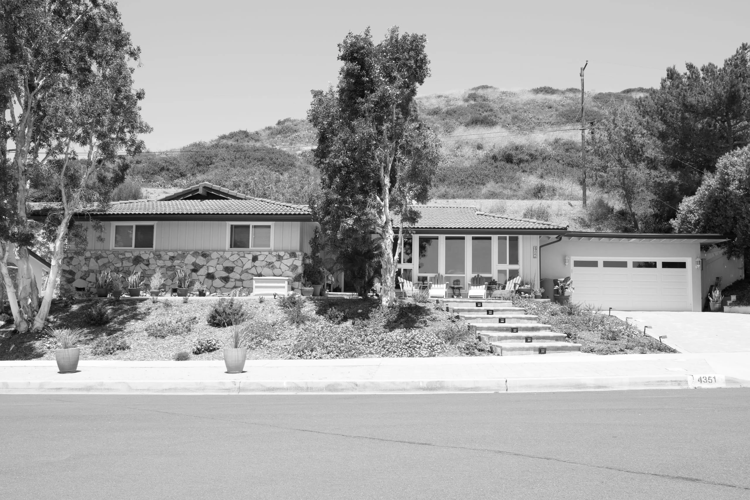 Black and white photograph of a single-story mid-century ranch house with stone and siding facades, a landscaped front yard, and a low hill with scrub brush in the distance