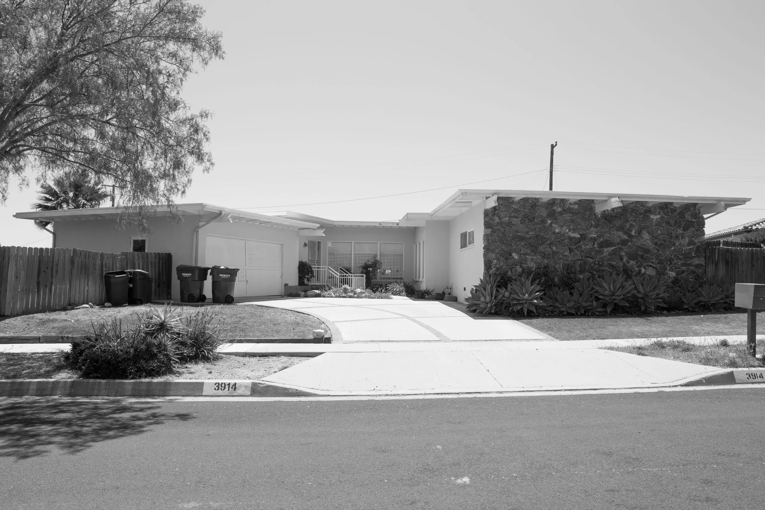 Black and white photograph of a single-story mid-century modern house with a cantilevered flat roof, stone accent wall, and dual concrete driveways; address 3914 marked on the curb