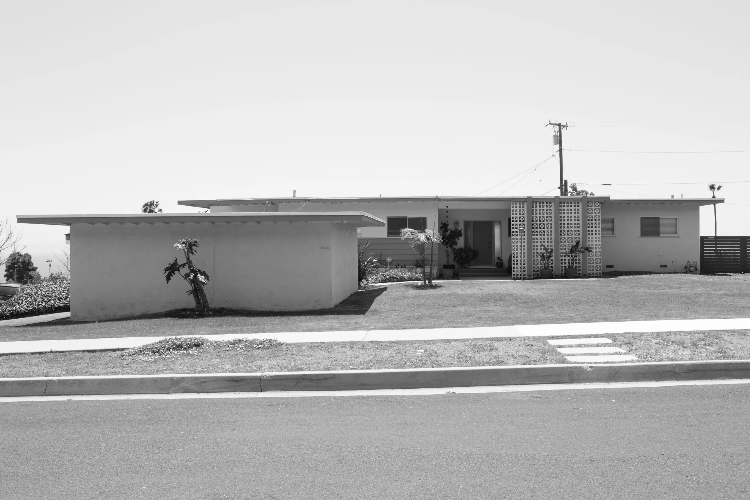 Black and white photograph of a flat-roofed mid-century modern single-story house viewed from across a street, with a decorative breeze block screen at the entry and a cantilevered roof overhang