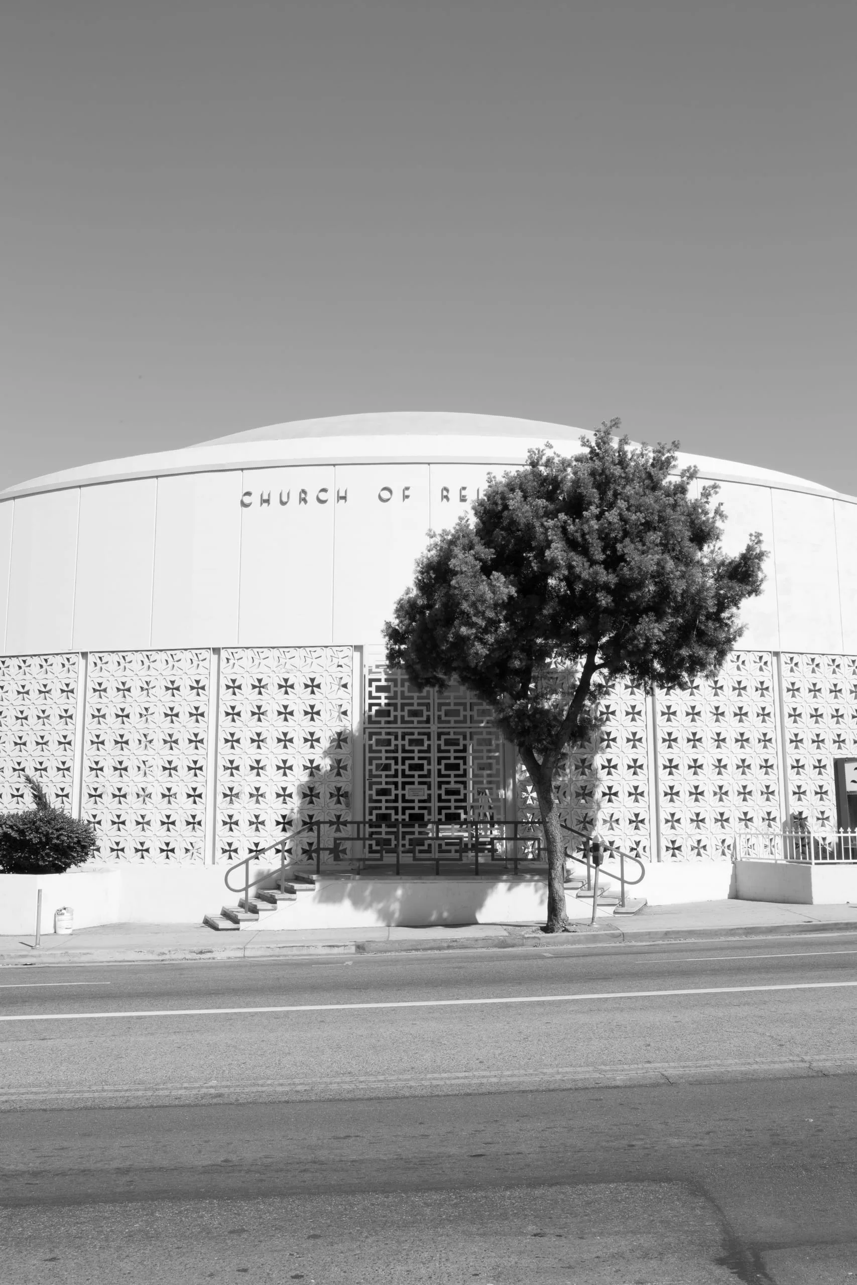 Black and white photograph of a domed church building with a decorative cross-pattern screen wall facade, partially obscured by a single tree in front