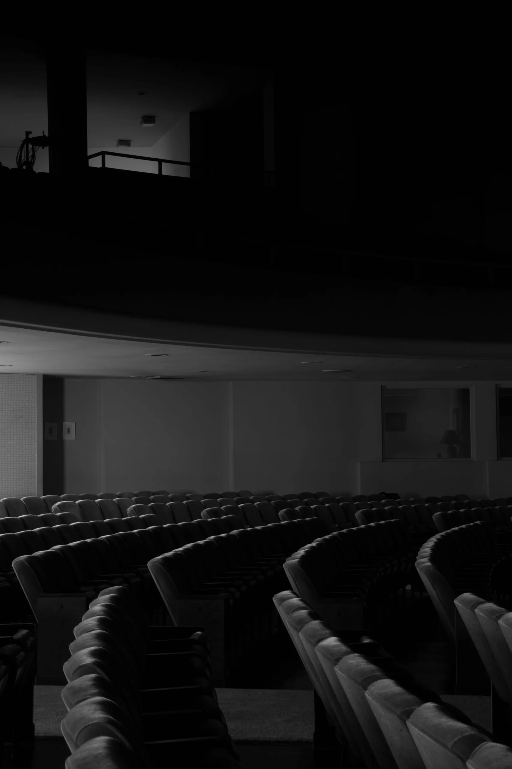 Black and white photograph of an empty theater interior, curved rows of dark seats receding toward a lit far wall, with a balcony overhang and glowing booth window above