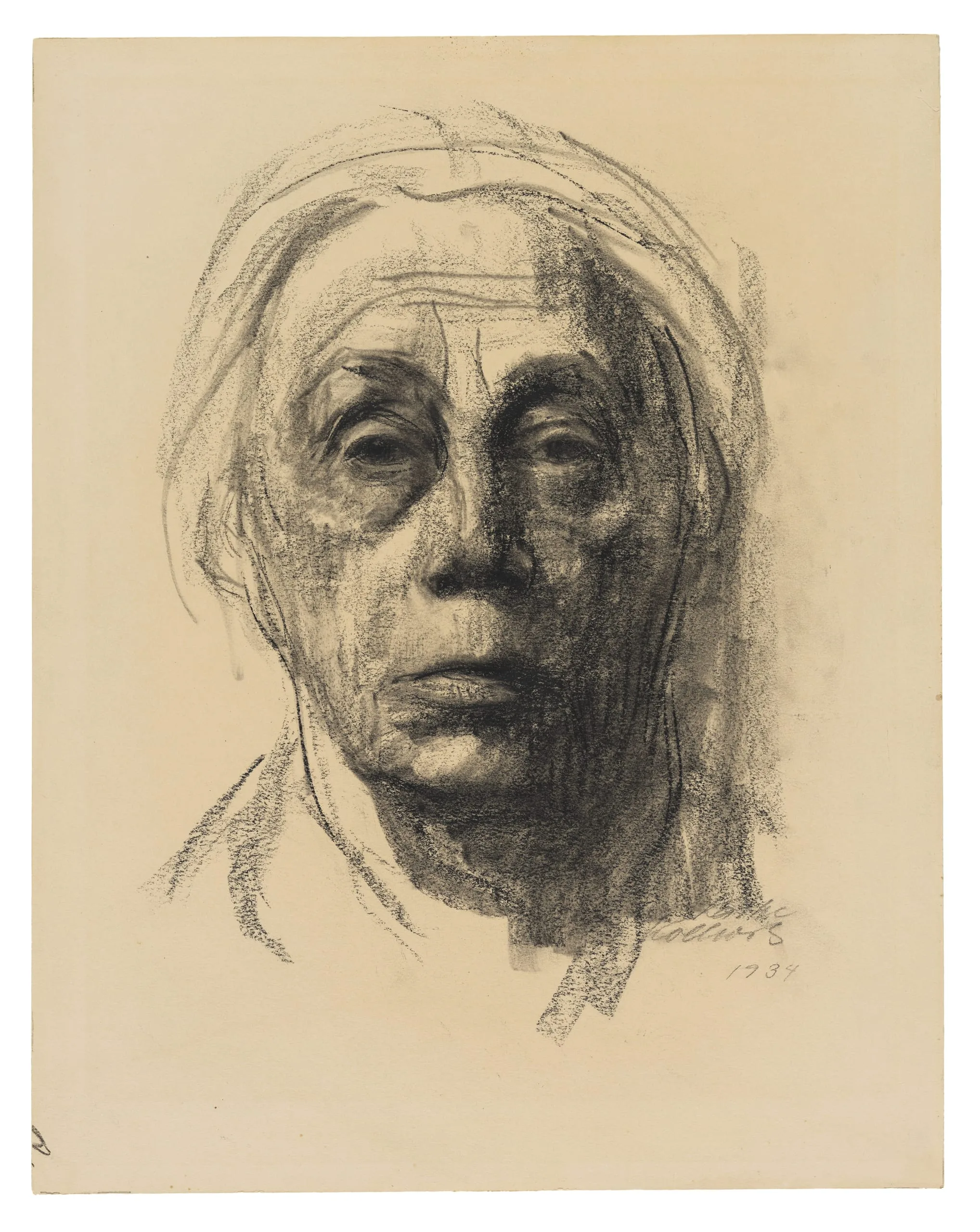 Käthe Kollwitz depicted her own face repeatedly throughout her life; in total, she drew or printed more than one hundred self-portraits and sculpted one bust. Her portraits are never idealized; the works record the physical transformations of time in a matter-of-fact way and exhibit her considerable skill in graphic media. When the Nazi regime came to power in 1933, the year before this drawing was made, Kollwitz was expelled from the Academy of Fine Arts and forbidden from teaching.