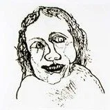 Square print of a young child's face in loose black ink lines on cream paper, with wide-set eyes, open mouth showing teeth, and curly hair