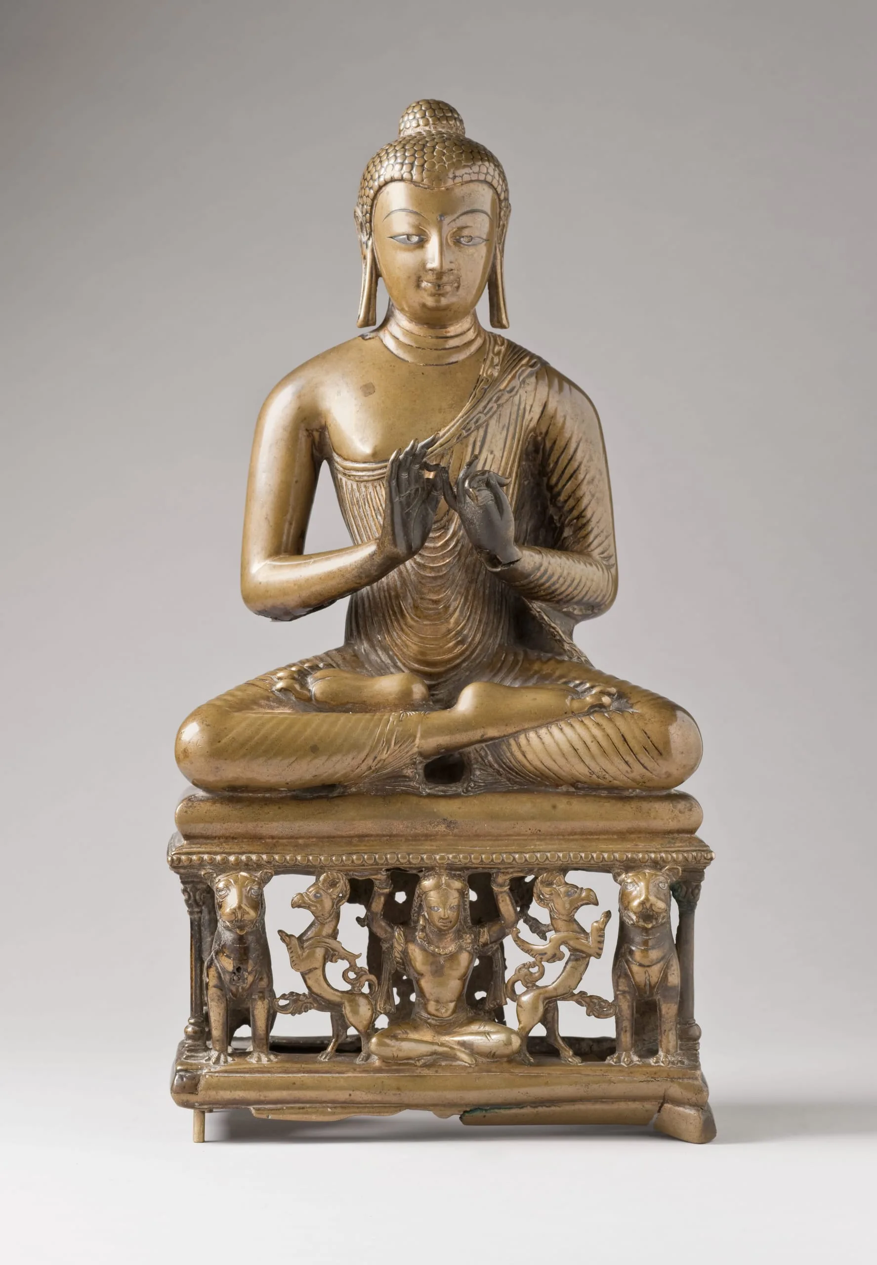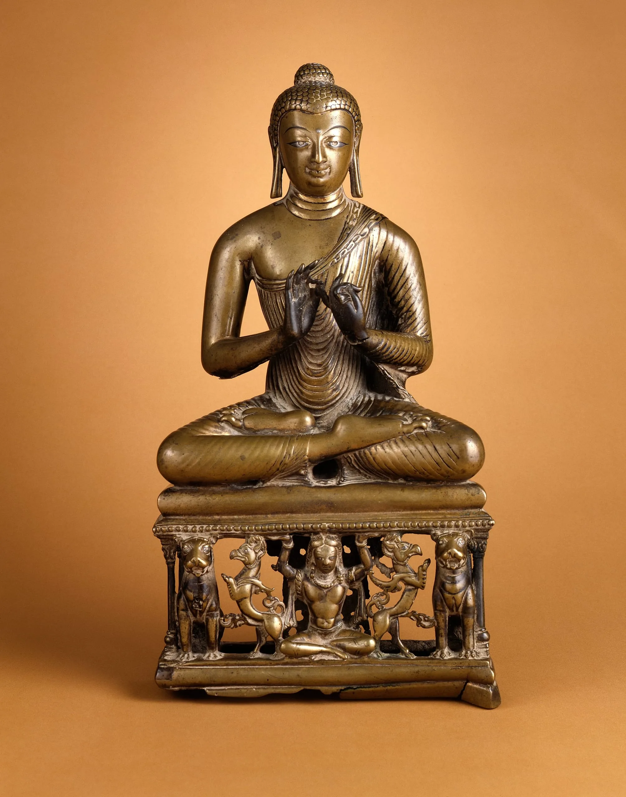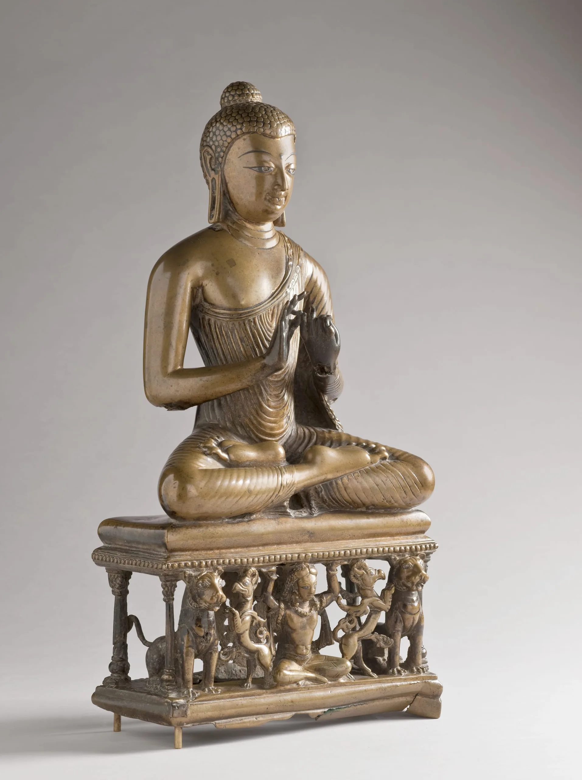 The historical Buddha Shakyamuni, traditionally dated to 563–483 BCE, or the transcendent Jina Buddha Vairochana in Akanishta Heaven, is represented in this elegant Kashmiri image. Both Buddhas hold their hands in the gesture of Turning the Wheel of the Law (dharmachakra mudra) and both sit with their feet being crossed in meditation (dhyana asana). The Buddha has the cranial protuberance (ushnisha) emblematic of his omniscience, the circular forehead marking (urna) indicating his enlightenment, and elongated earlobes symbolizing his renunciation of the material world. He wears a pleated robe over one shoulder. A small lug at the base of his neck indicates that he once had a separately cast nimbus. He sits on a lion throne associated with royal imagery that emphasizes his spiritual sovereignty. A demigod (yaksha) supports the throne in the front. He is flanked by two rearing griffins. The back corners of the throne each have a column rising out of a pot with a flaring capital. A pierced foliate panel supports the middle of the throne in the rear.