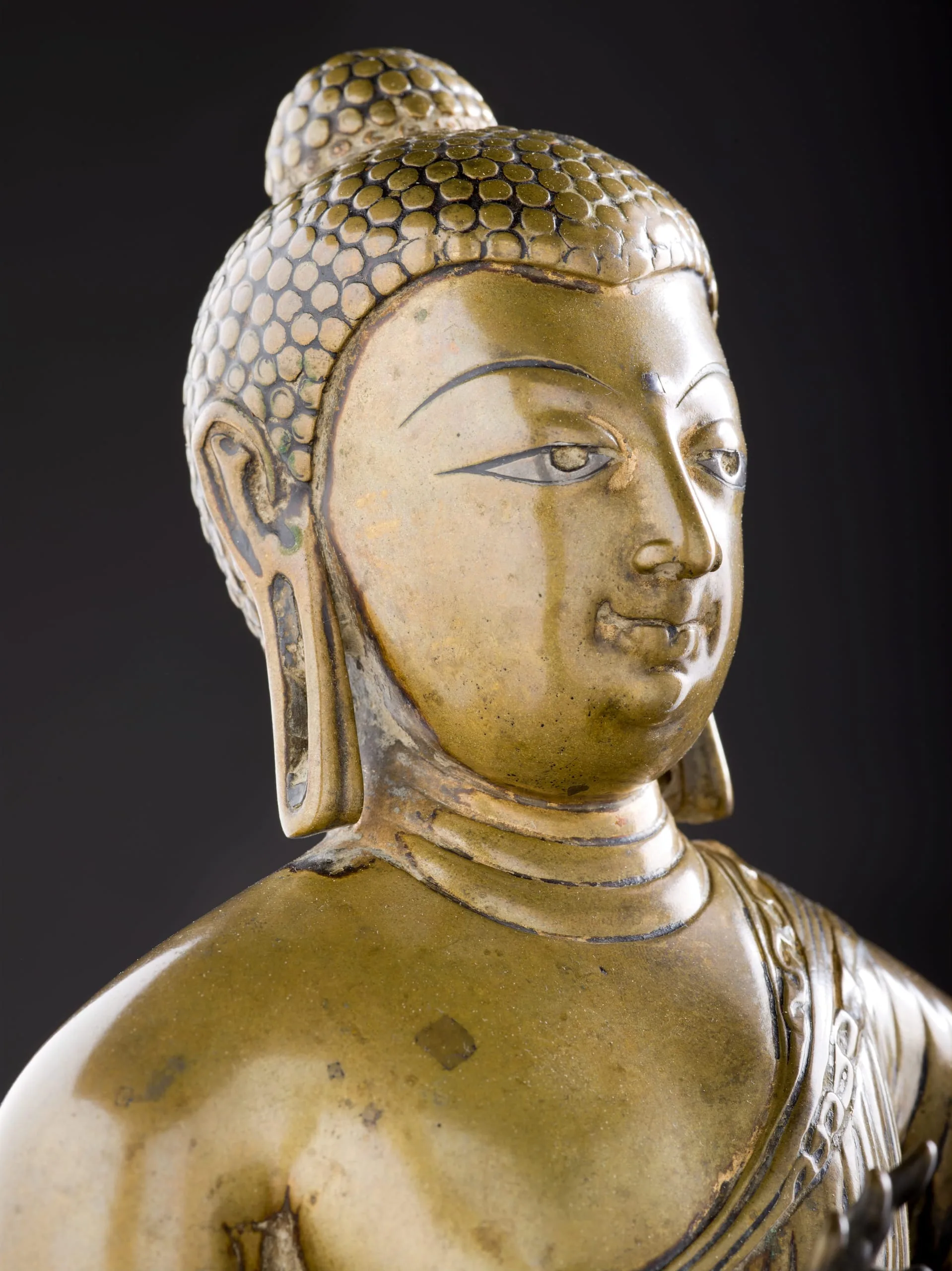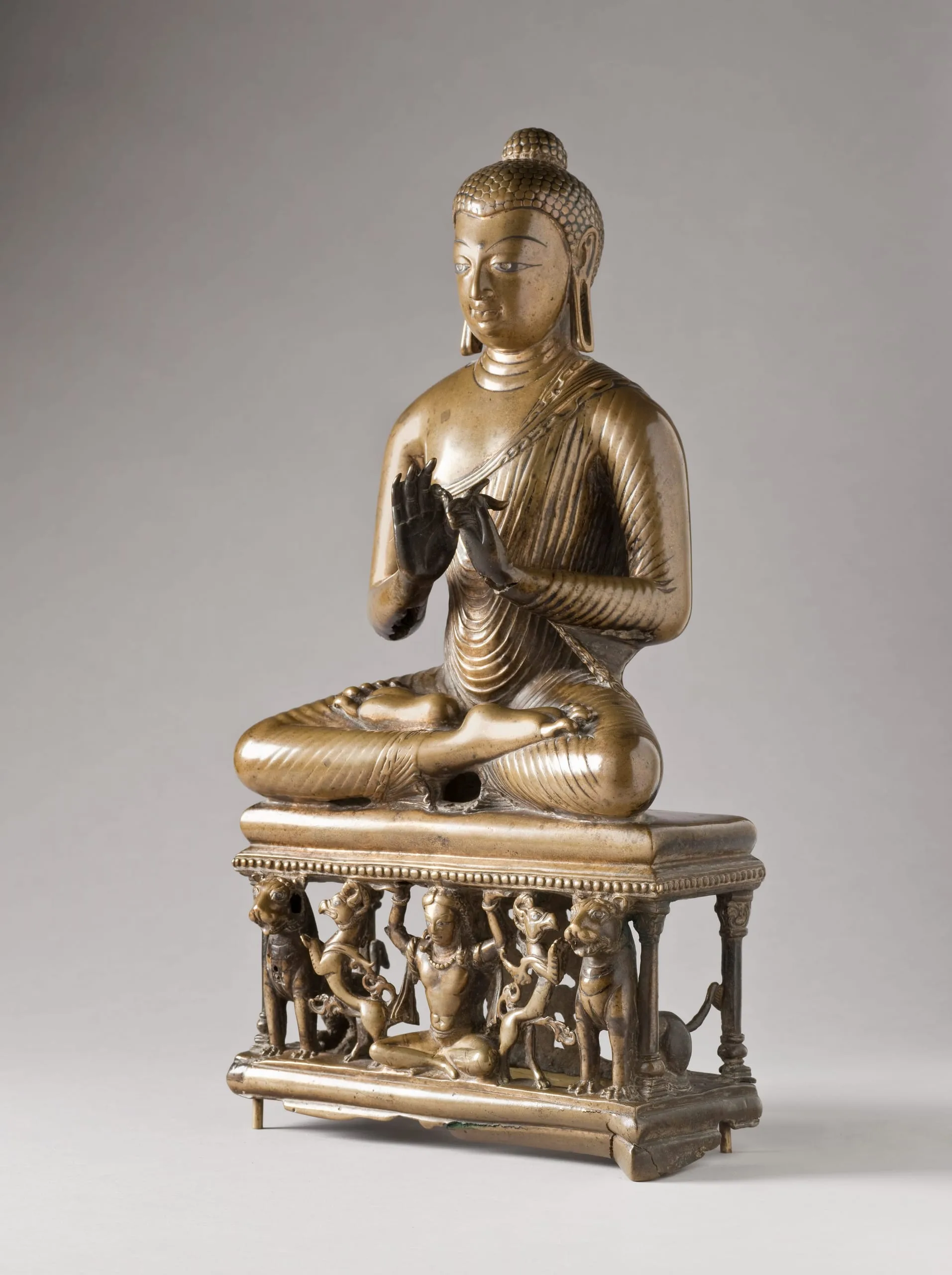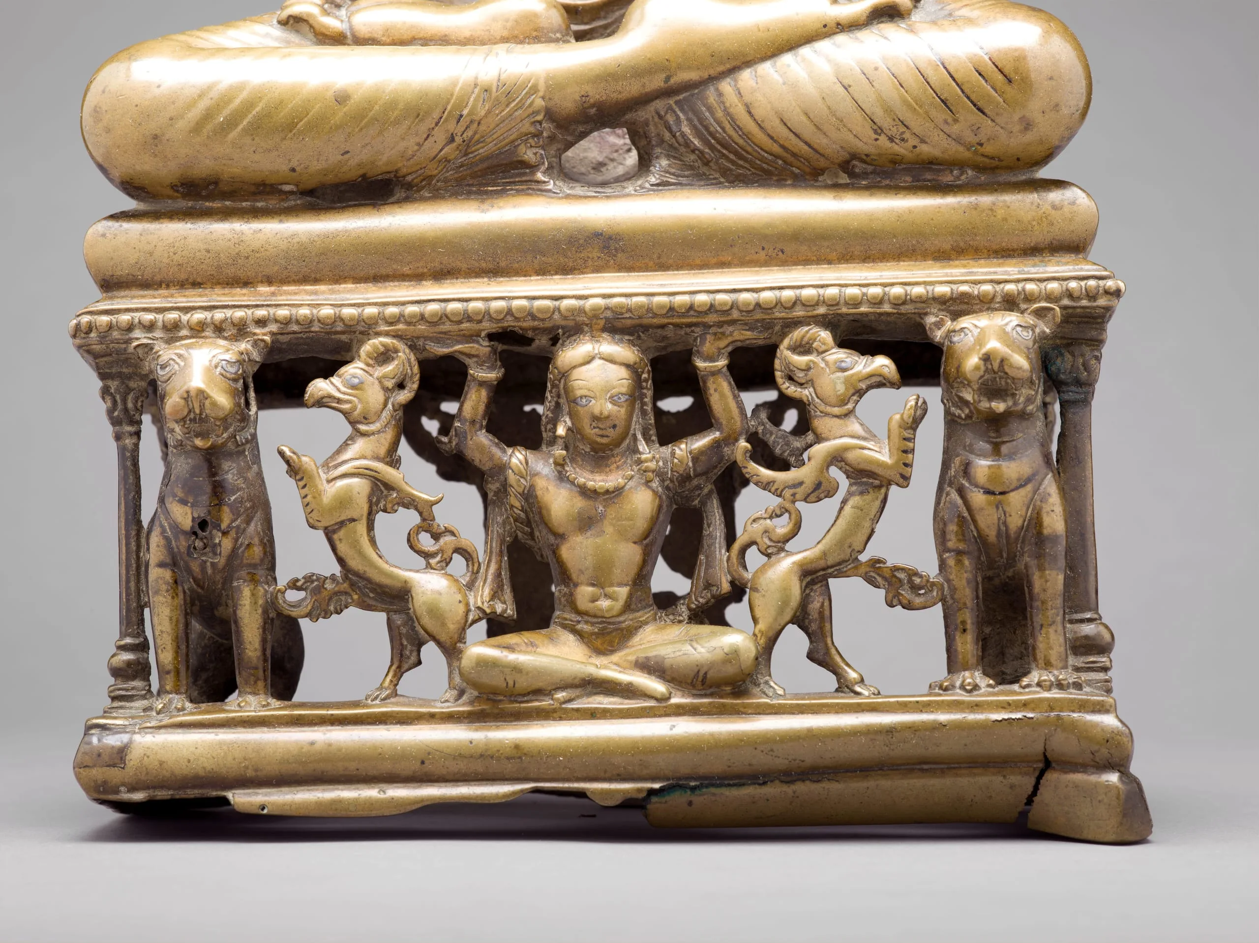 The historical Buddha Shakyamuni, traditionally dated to 563–483 BCE, or the transcendent Jina Buddha Vairochana in Akanishta Heaven, is represented in this elegant Kashmiri image. Both Buddhas hold their hands in the gesture of Turning the Wheel of the Law (dharmachakra mudra) and both sit with their feet being crossed in meditation (dhyana asana). The Buddha has the cranial protuberance (ushnisha) emblematic of his omniscience, the circular forehead marking (urna) indicating his enlightenment, and elongated earlobes symbolizing his renunciation of the material world. He wears a pleated robe over one shoulder. A small lug at the base of his neck indicates that he once had a separately cast nimbus. He sits on a lion throne associated with royal imagery that emphasizes his spiritual sovereignty. A demigod (yaksha) supports the throne in the front. He is flanked by two rearing griffins. The back corners of the throne each have a column rising out of a pot with a flaring capital. A pierced foliate panel supports the middle of the throne in the rear.