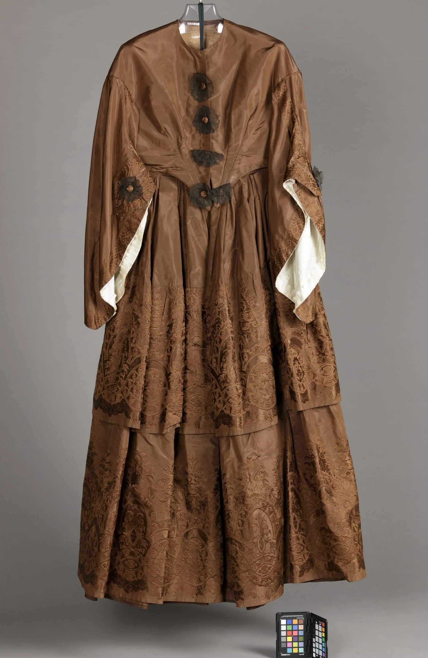 - Bodice: silk plain weave (taffeta) with silk compound weave and linen lace; Skirt: silk plain weave (taffeta) and silk compound weave
