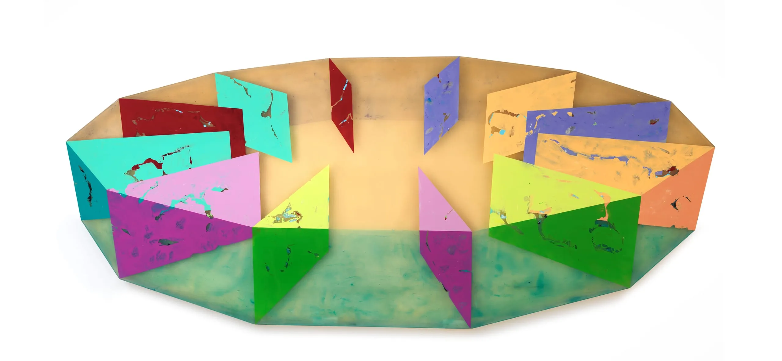 Ronald Davis began his art career making gestural oil-on-canvas paintings but was soon inspired to explore geometric forms and optical illusions. In order to experiment with the representation of space, he needed a medium that allowed him to create unusual shapes and illusionistic depth, and that permitted the viewer to look at and intothe work simultaneously: polyester resin. Roto is from his second series of resin paintings, made in 1968–69, known as the Dodecagons, or twelve-sided forms. Roto’s composition appears both to recede from and extend into the viewer’s space.