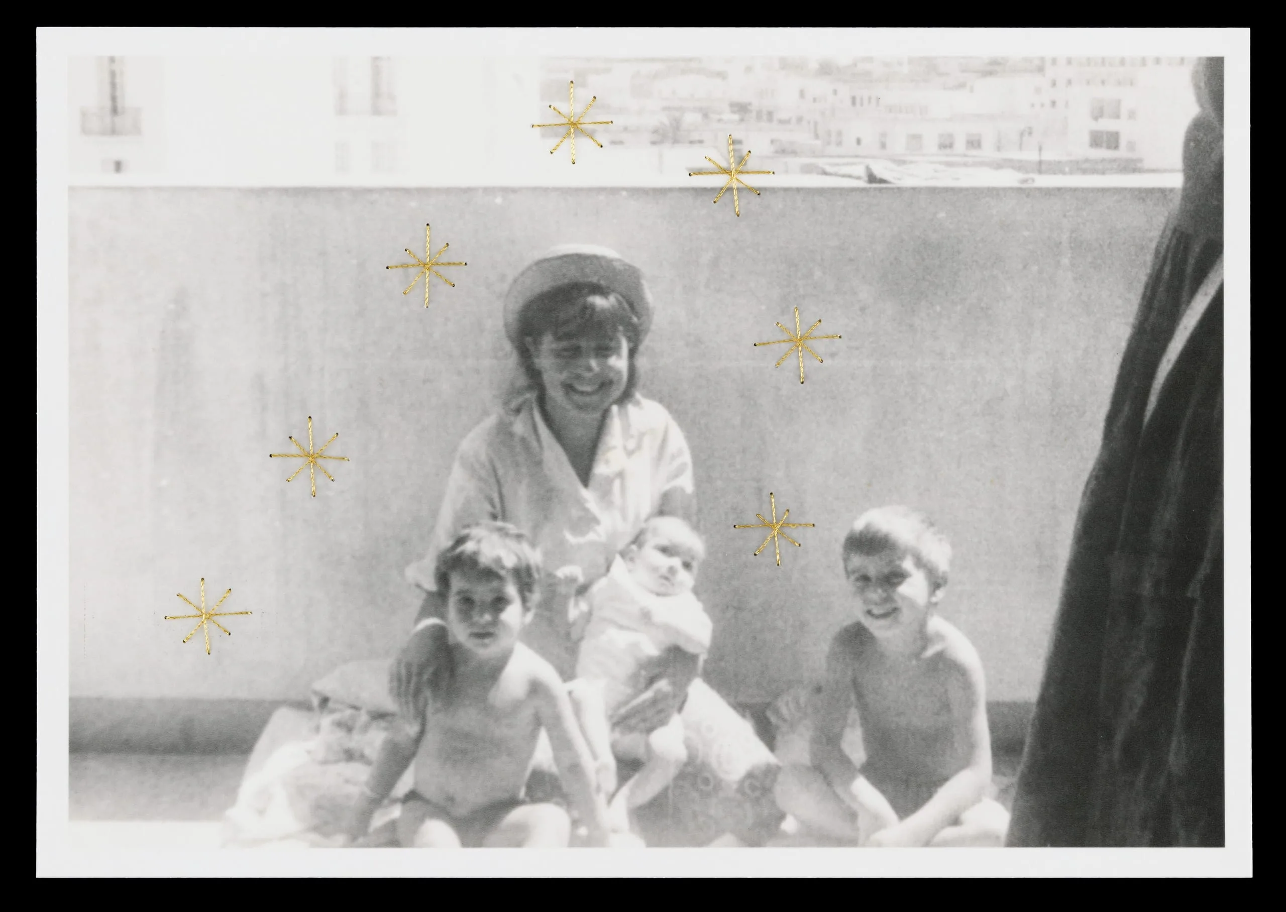 Black and white snapshot altered with gold starburst drawings, showing a smiling woman in a cap holding an infant, flanked by two young boys on a rooftop terrace