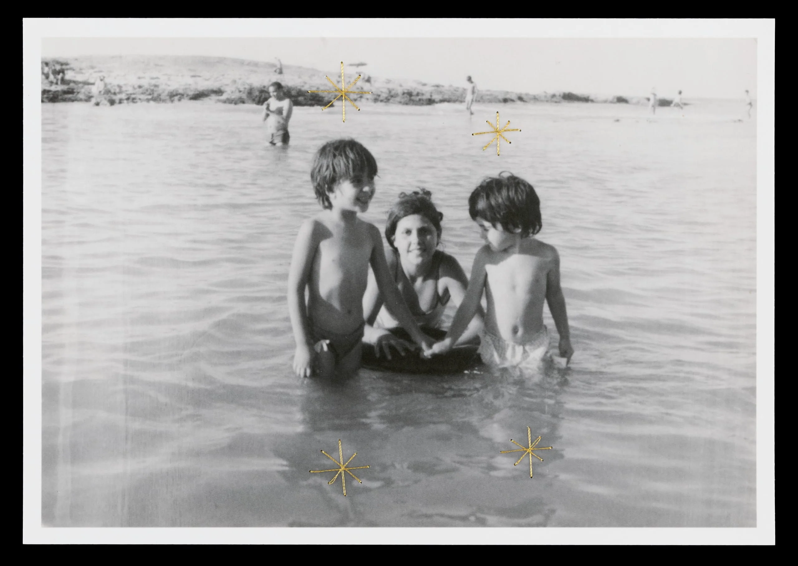 Black and white photograph, three dark-haired children sitting together in shallow beach water, with four small gold starburst shapes added to the surface