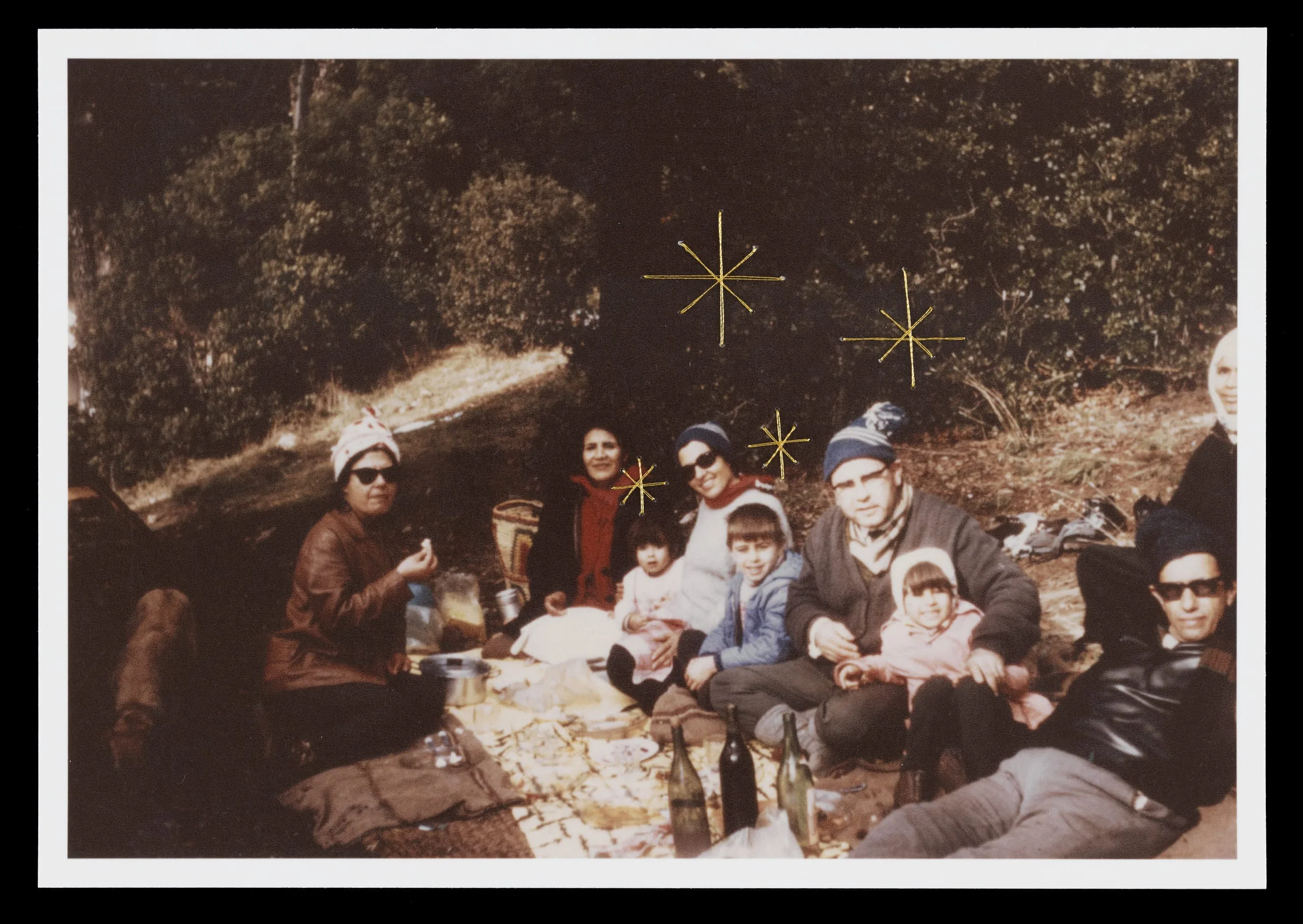 Color snapshot of a group of adults and children at an outdoor picnic on blankets, with four hand-drawn yellow starburst shapes overlaid on the image