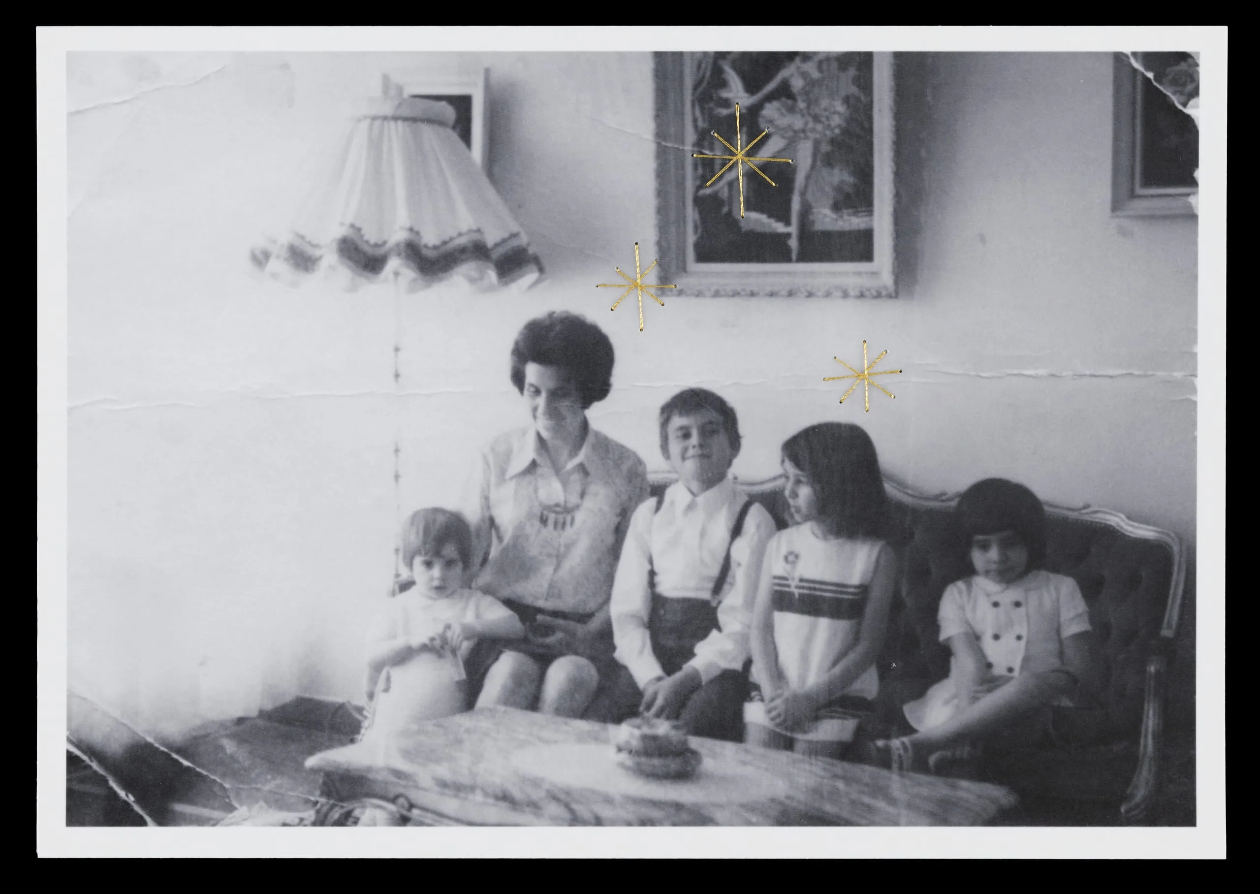 Worn black and white snapshot of a woman and four children seated on a sofa indoors, with gold star shapes drawn over the image
