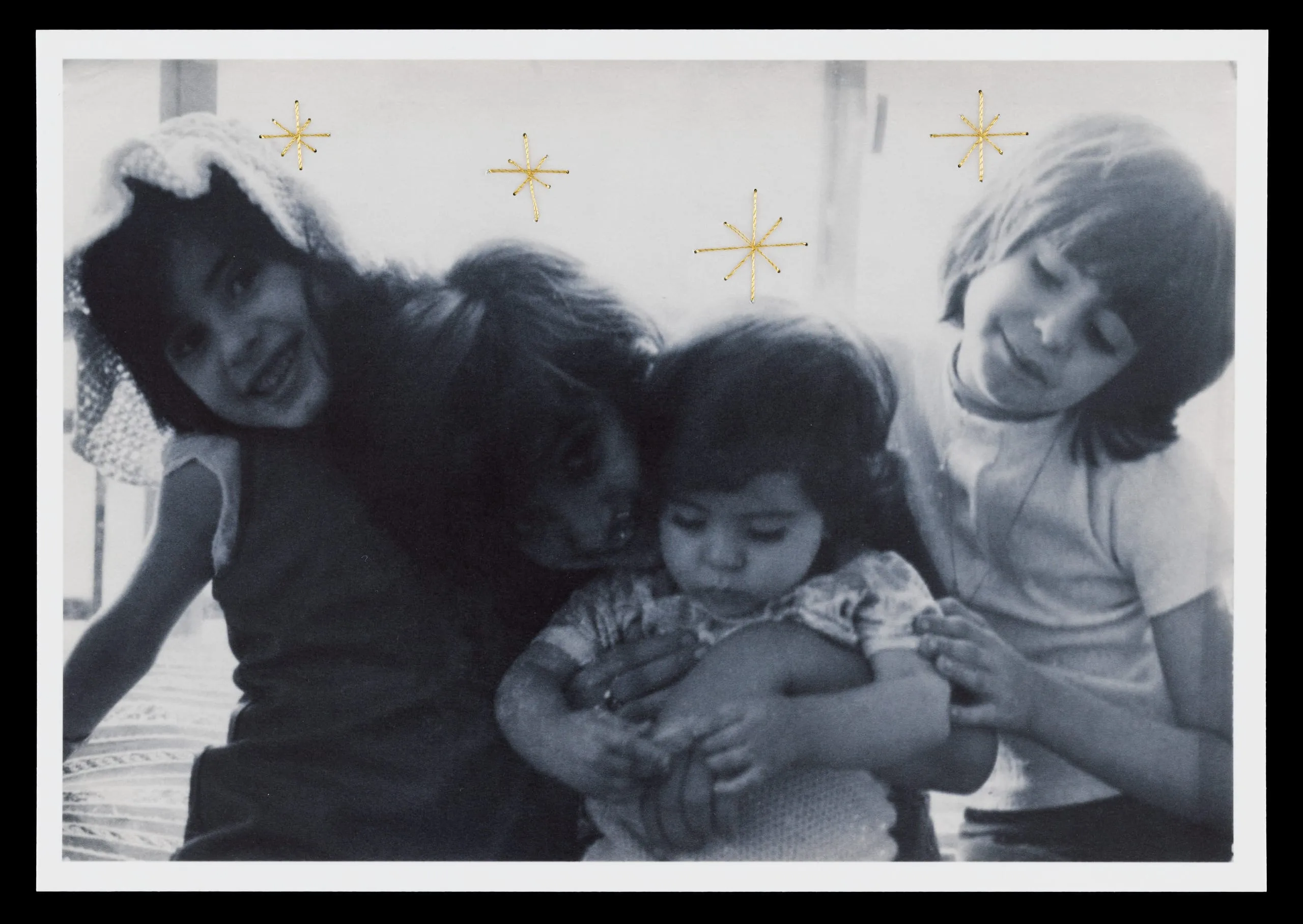 Black and white photograph of four children with brown skin huddled together, three older children surrounding an infant, with gold starburst shapes overlaid on the image