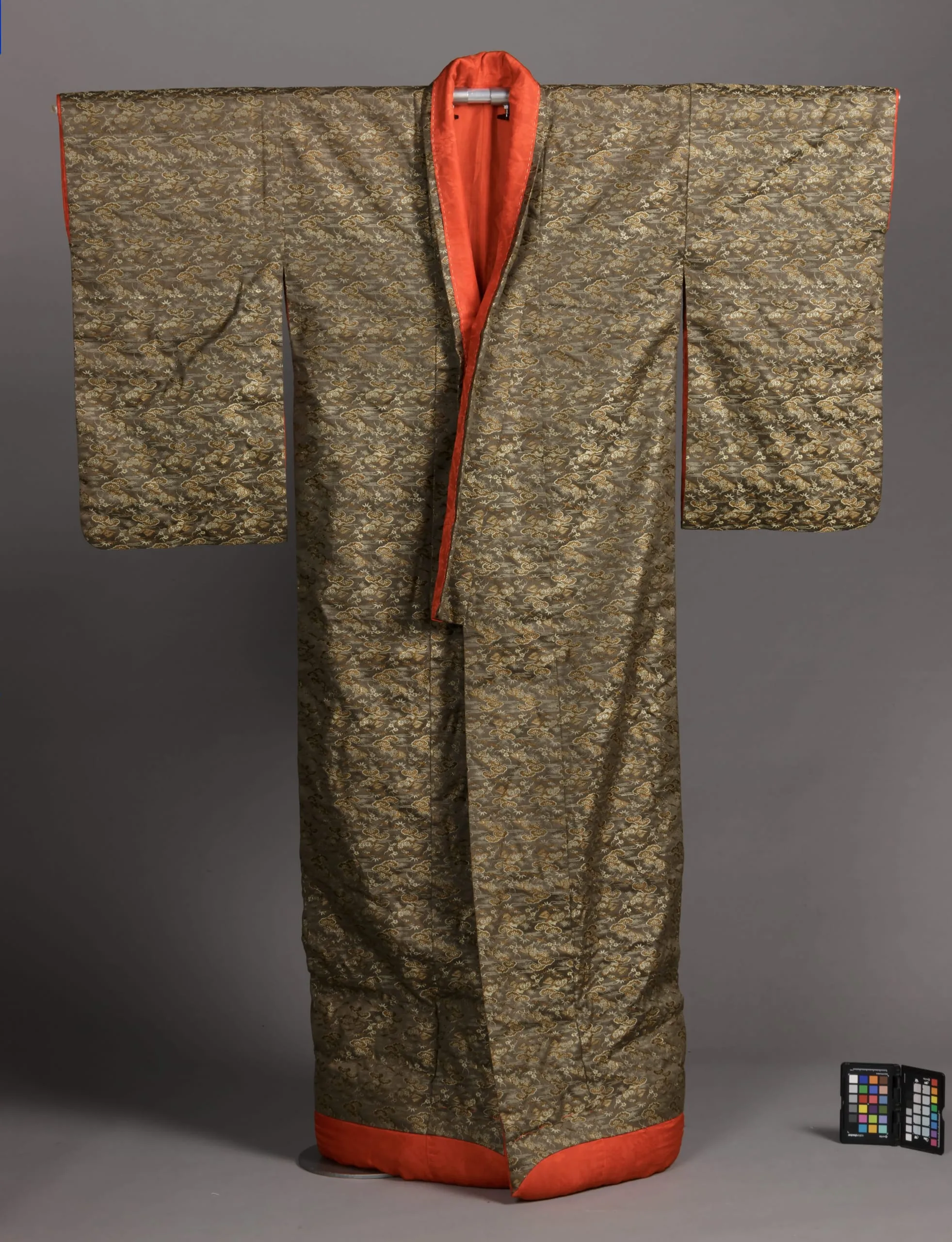 - Woman's Outer Kimono (Uchikake) with Pattern of Pine, Plum Blossoms, Cranes, and Fans