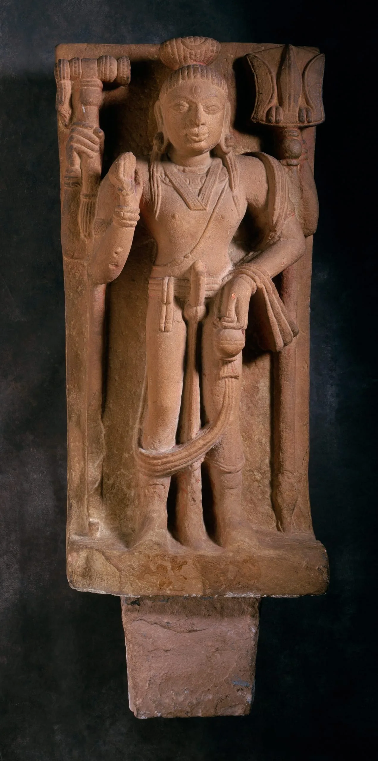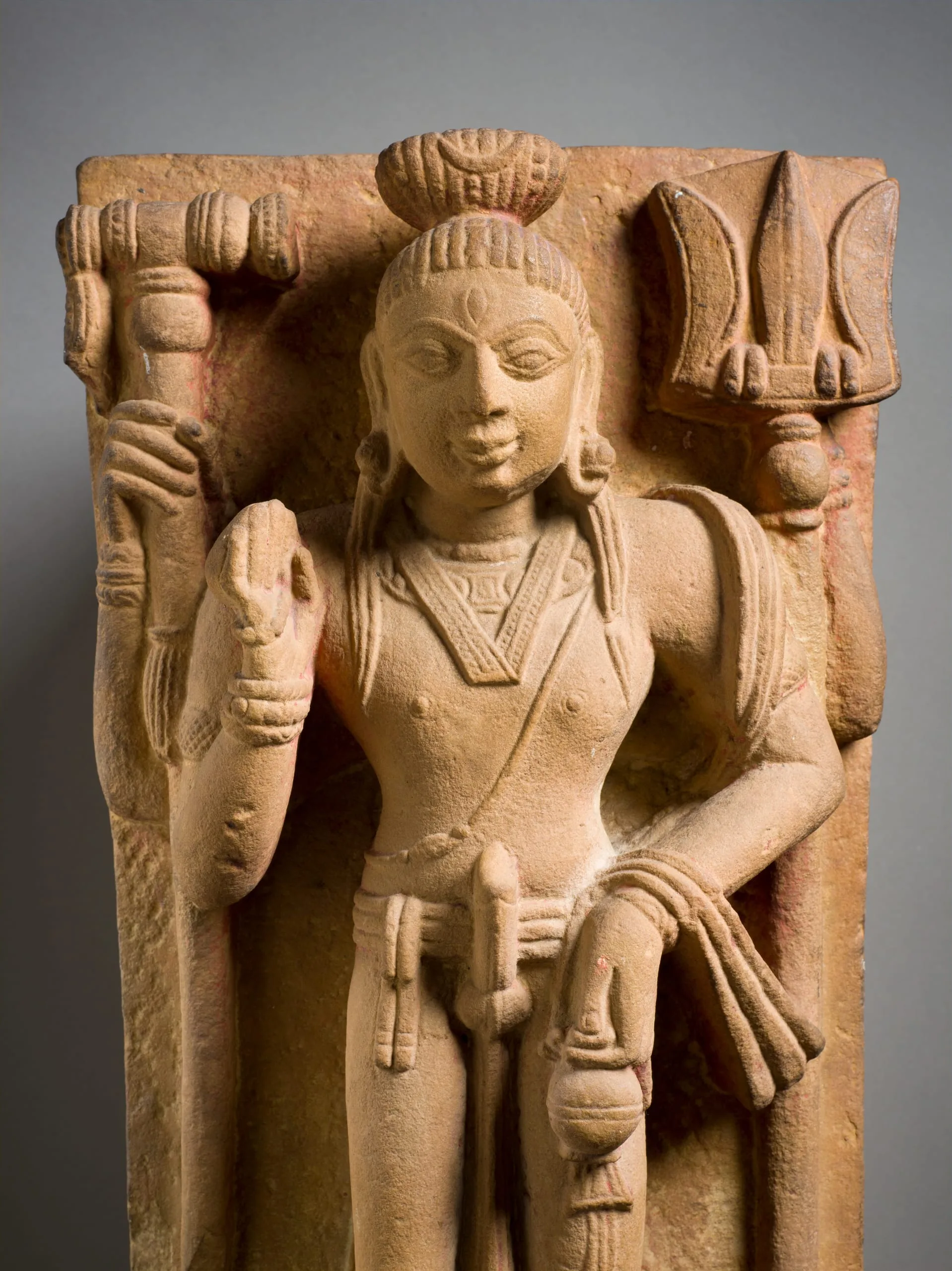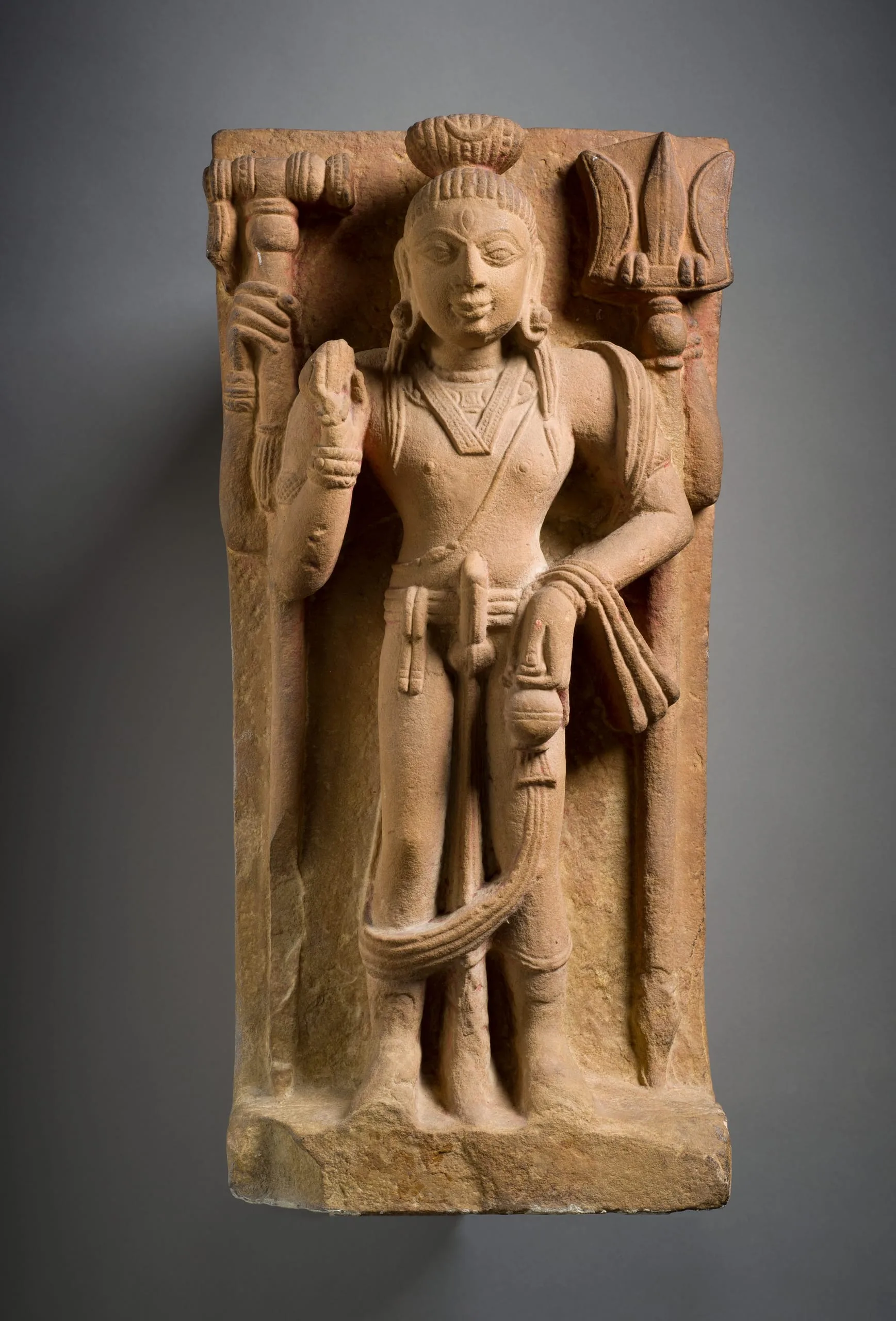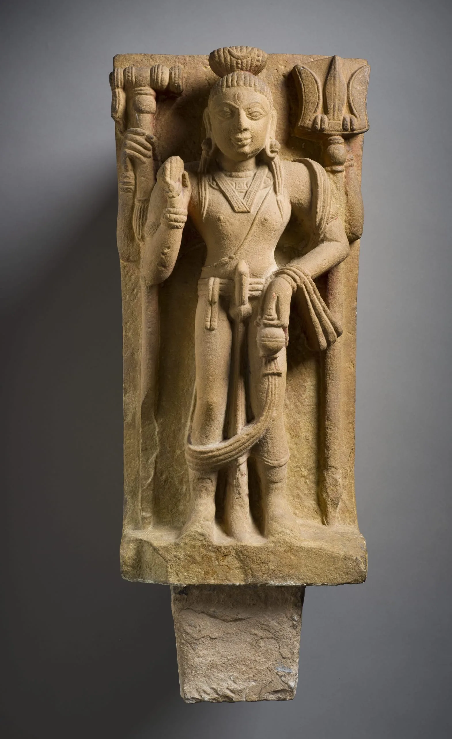 Shiva, the Hindu god of Destruction, stands in a stiff, frontal pose (samapada sthanaka) on a plain base with a large insertion tang extending beneath it. He has an ascetic’s piled hair (jata mukuta), which is tied in a bun and adorned with his attribute of the crescent moon. He has a third eye of wisdom (jñana netra), and is ithyphallic (urdhva linga) symbolizing the generative energy of the universe. He wears the Brahmanical sacred thread (yajñopavita) over his left shoulder, a dhoti, and a long sash draped over his left shoulder and forearm. He has four arms. In his upper right hand, he holds a mallet (mudgara) or an unusual staff. In his upper left hand, he holds a trident (trishula). His lower right hand is held in the gesture of reassurance (abhaya mudra) and holds a rosary (akshamala). He carries an ascetic’s waterpot (kamandalu) in his lower left hand.