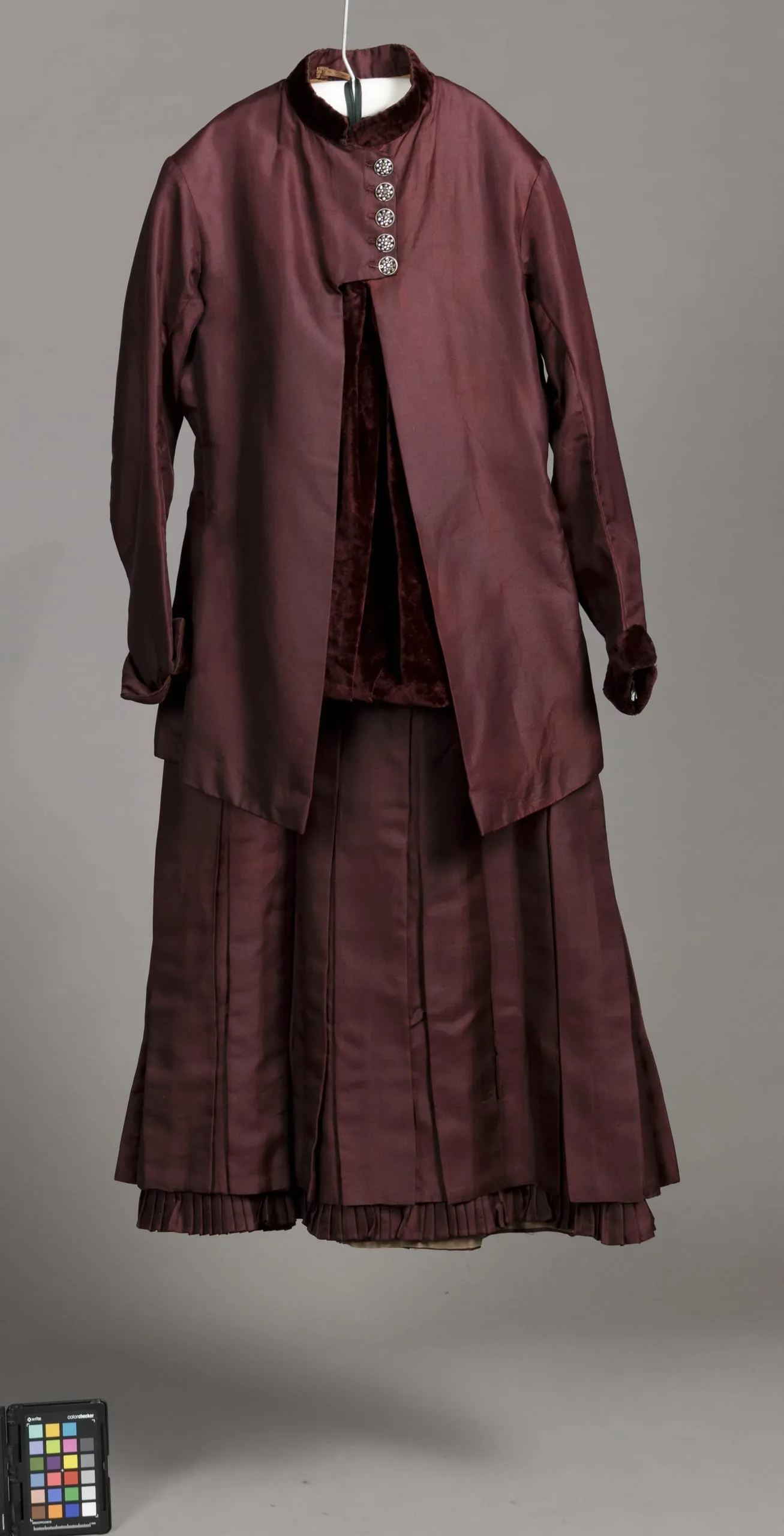 - Silk twill, silk velvet, and metal buttons (marquisite)