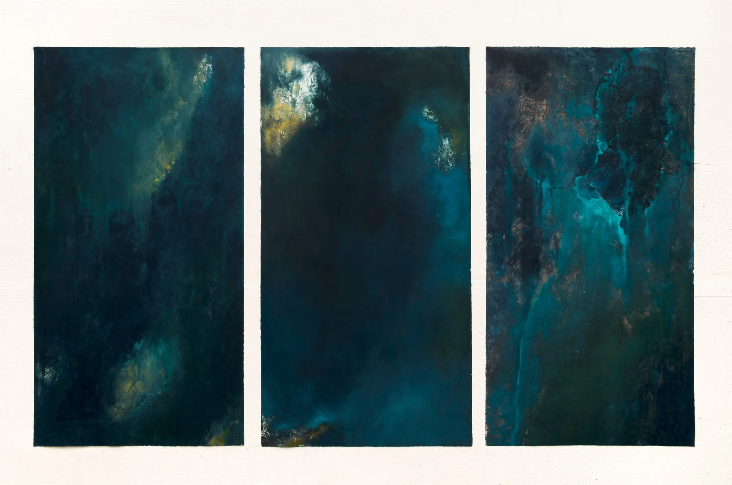 - three monoprints and intaglio debossing with gouache, colored pencil, and powdered pastel on paper mounted on Sintra