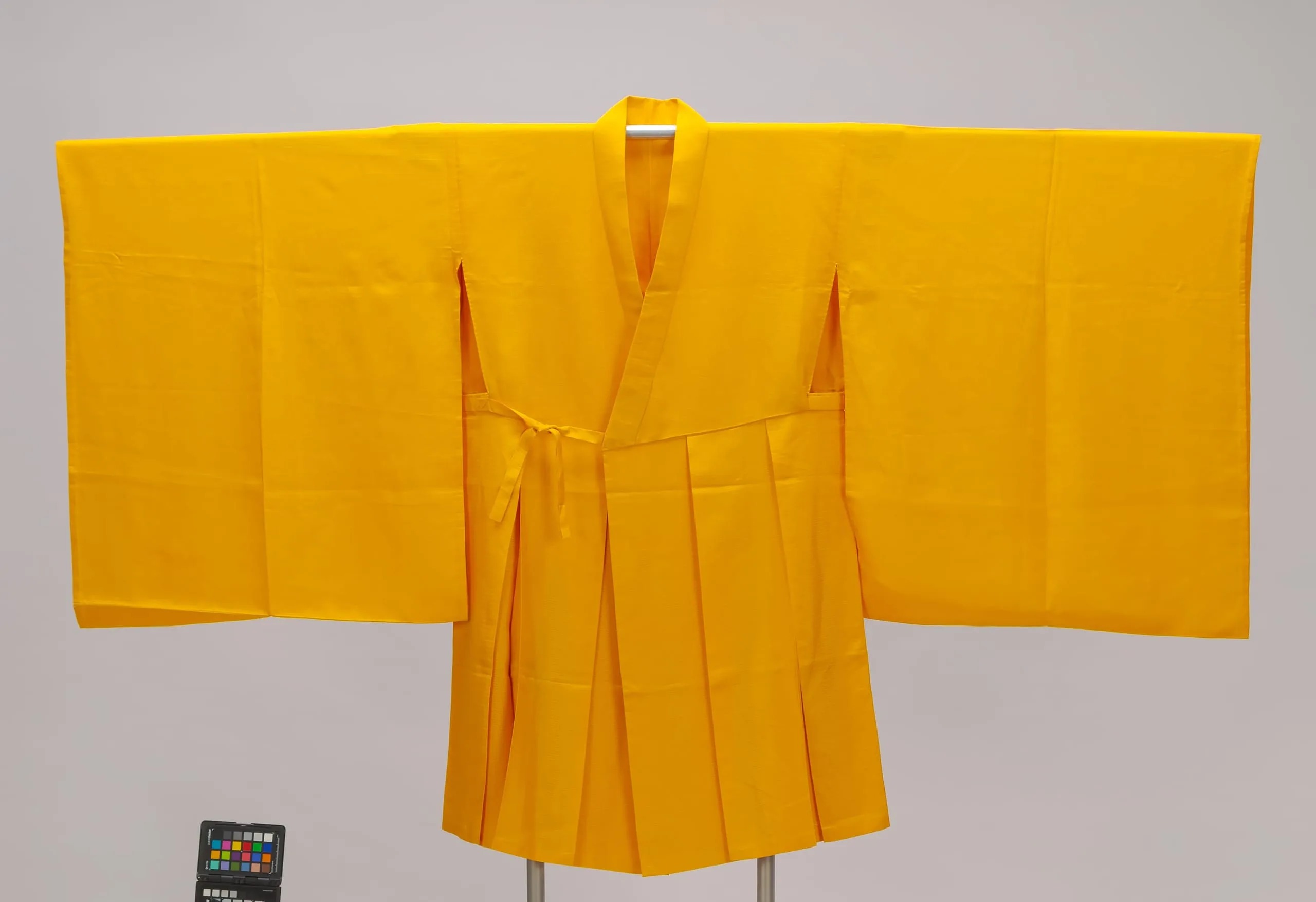 Marigold-yellow Japanese-style robe displayed on a mount with arms extended, showing deep pleats at the front skirt and a knotted fabric tie at the waist