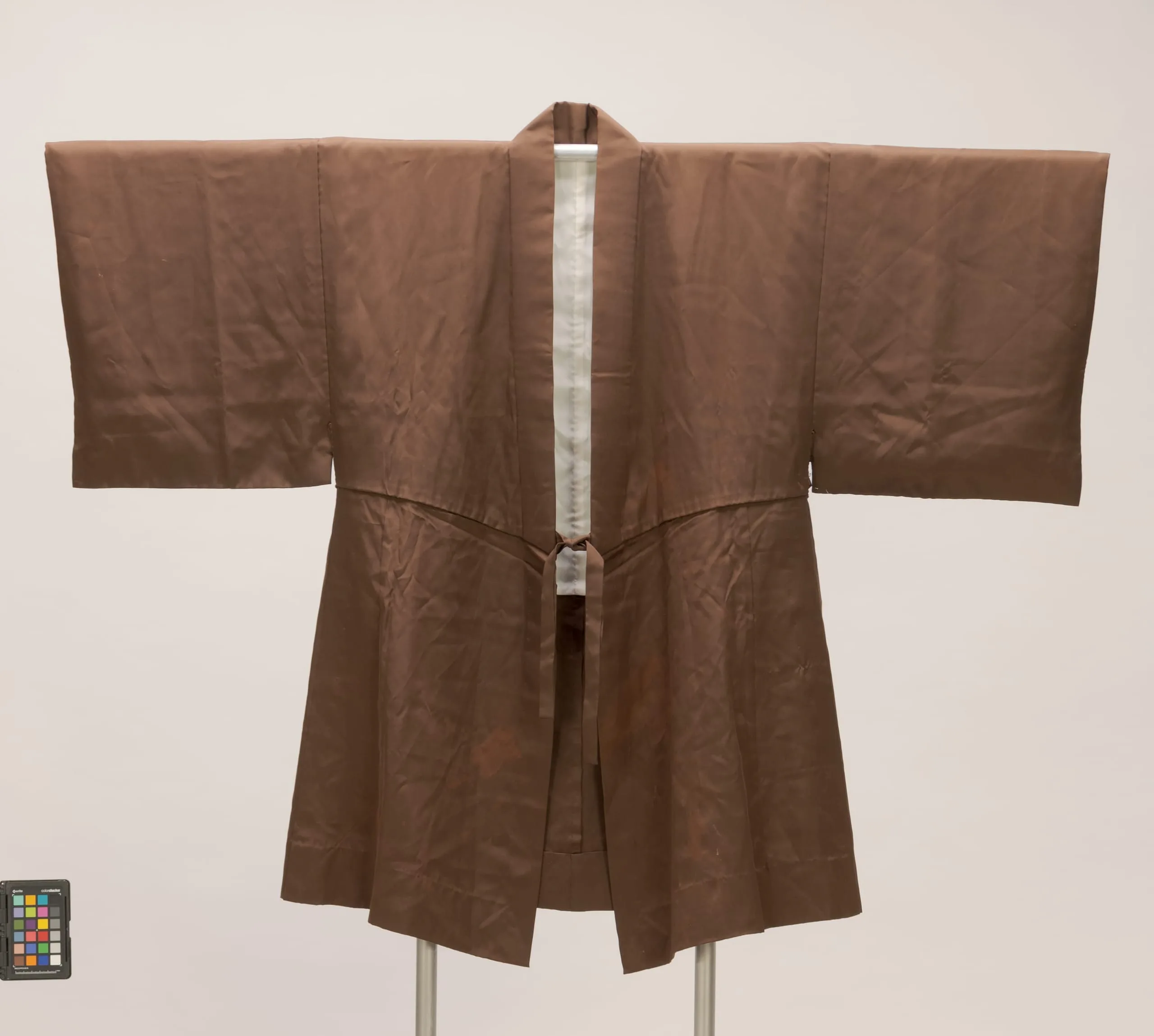 - Buddhist Priest's Informal Robe (kairyō) of brown silk plain weave with self ties. Lined with white silk plain weave. Daimaru label: 渡辺藤兵衛法衣仏具店 (Watanabe Fujiheiei Hoi Butsugu Ten)