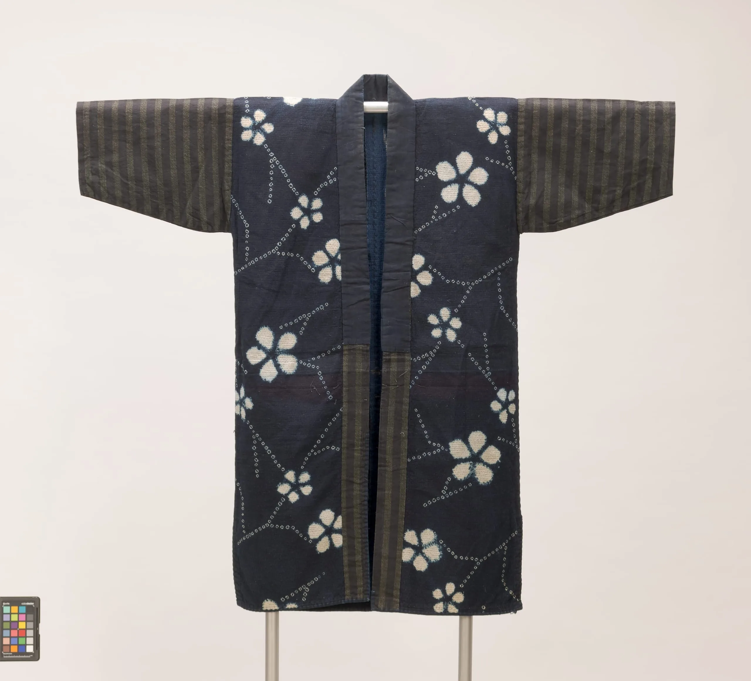 - Cotton plain weave, tie-resist dyed (bōshi and kanoko shibori), quilted (sashiko); cotton plain weave, tie-resist dyed warp and weft ikat (tate and yoko kasuri)