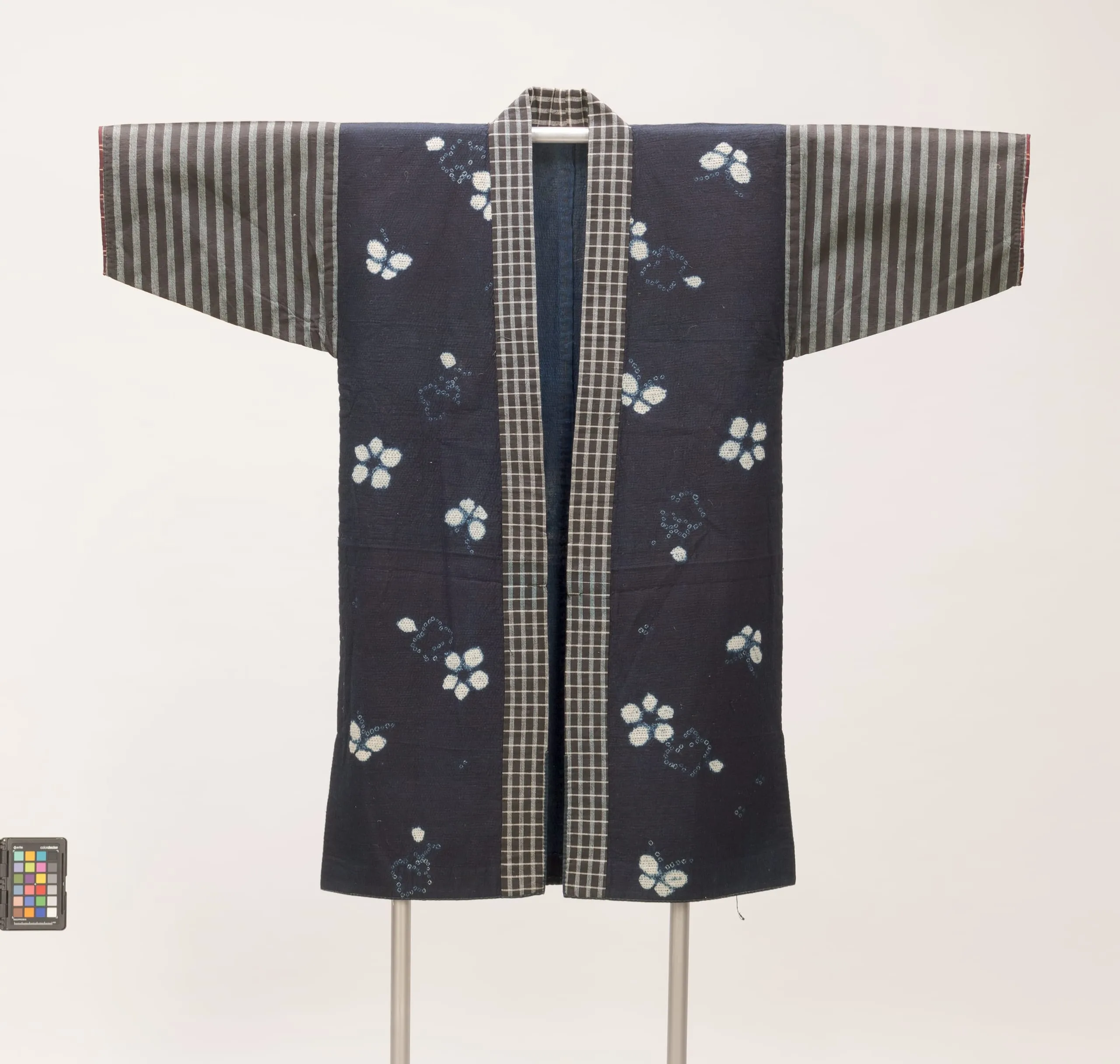 - Cotton plain weave, tie-resist dyed, quilted (sashiko); cotton plain weave