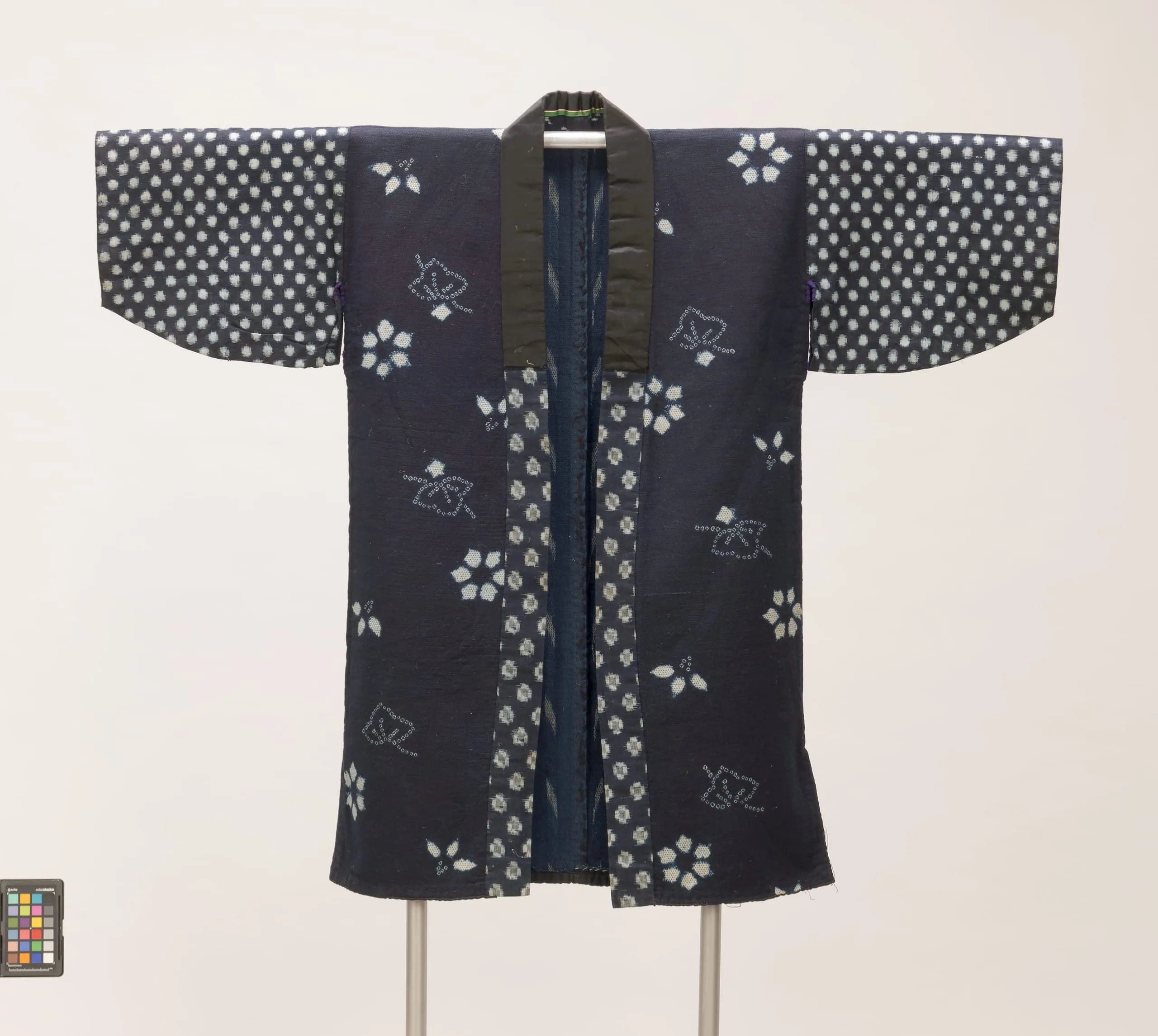 - Cotton plain weave, tie-resist dyed (bōshi and kanoko shibori), quilted (sashiko); cotton plain weave, tie-resist dyed warp and weft ikat (tate and yoko kasuri)