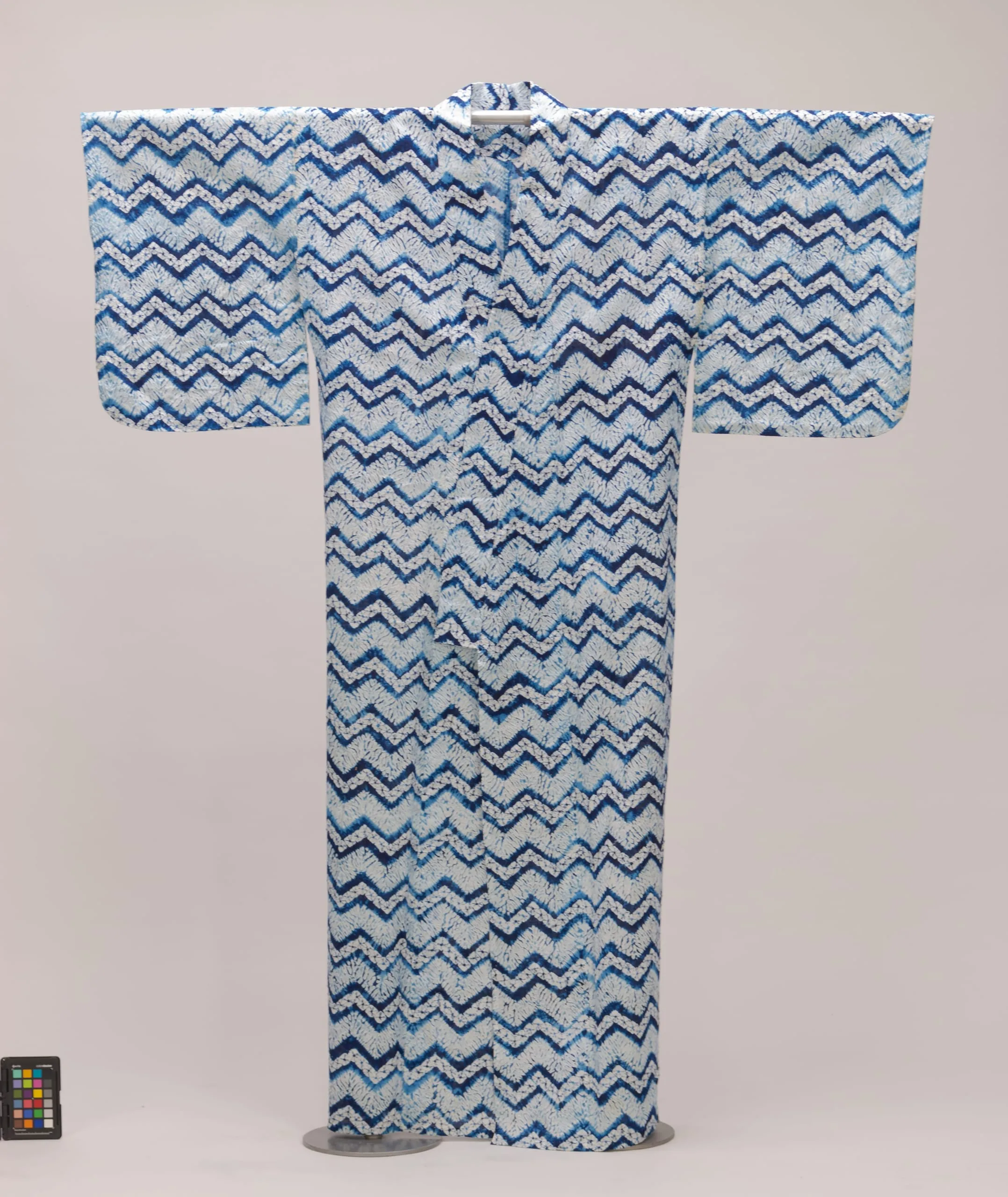 - Cotton plain weave, stitched and capped tie-resist dyed (nuishime and boshi? shibori)