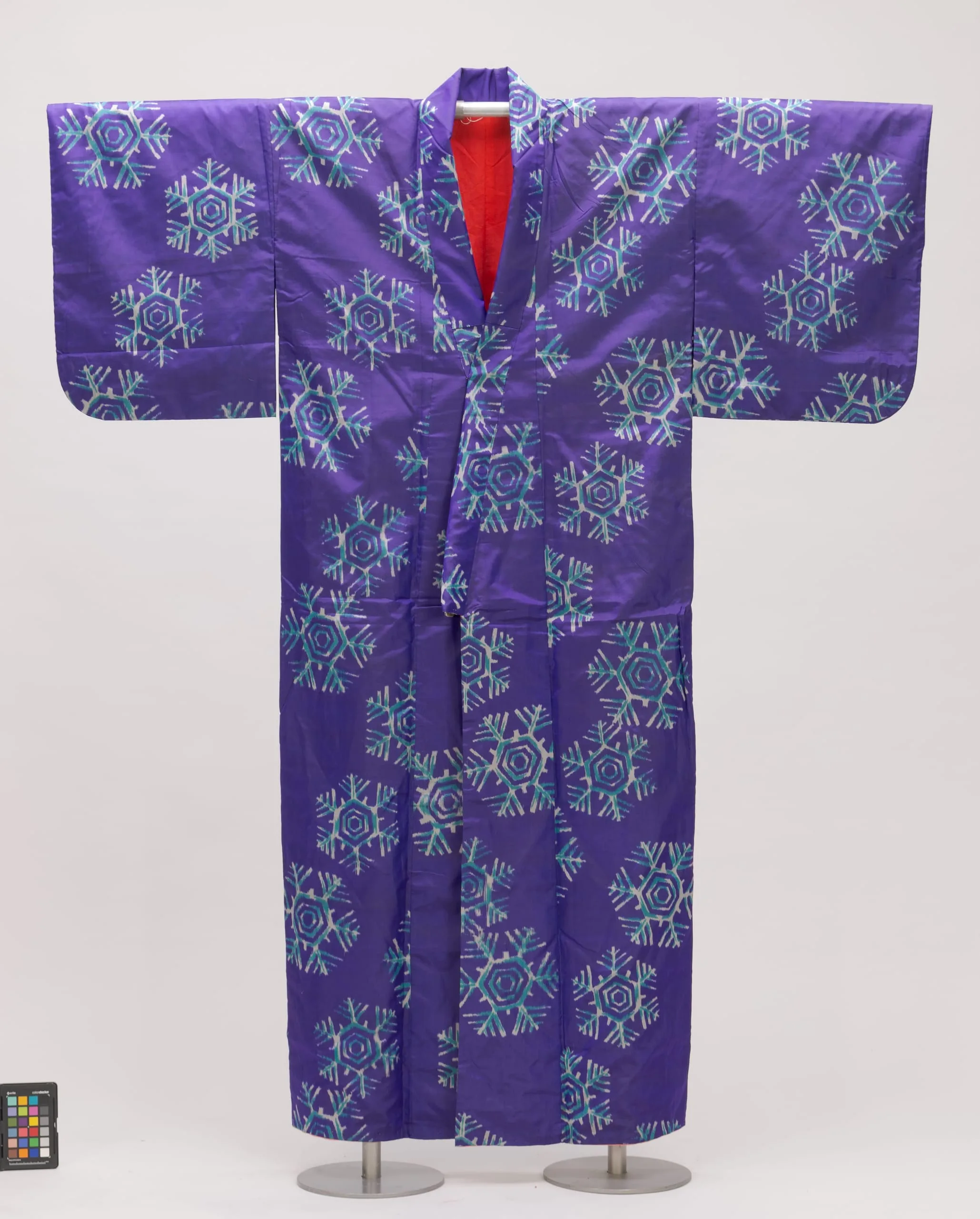 - Silk plain weave with stencil-printed warp ikat (hogushi kasuri meisen)