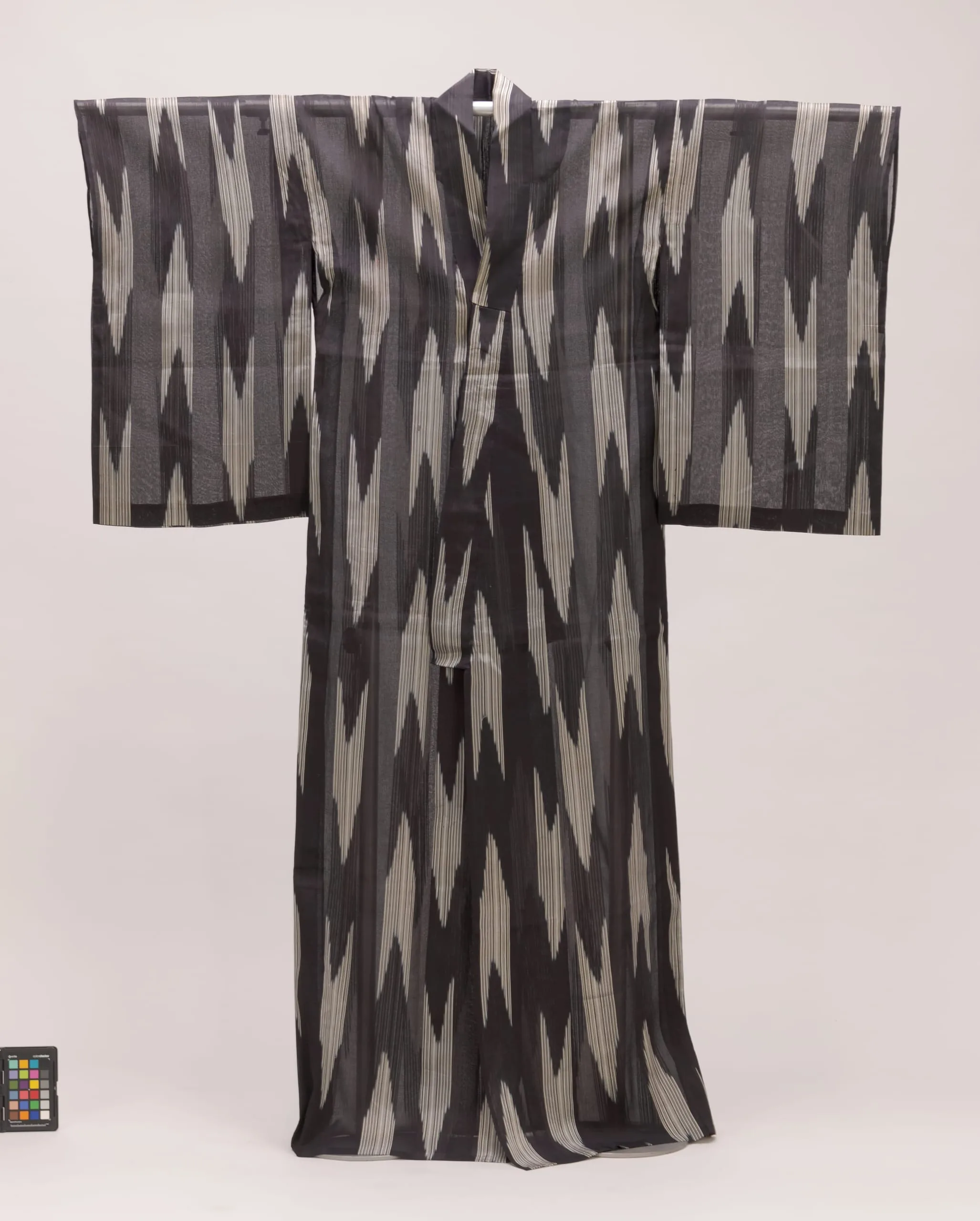 - Silk plain weave (crepe, chirimen) with tie-resist dyed warp ikat (kasuri)