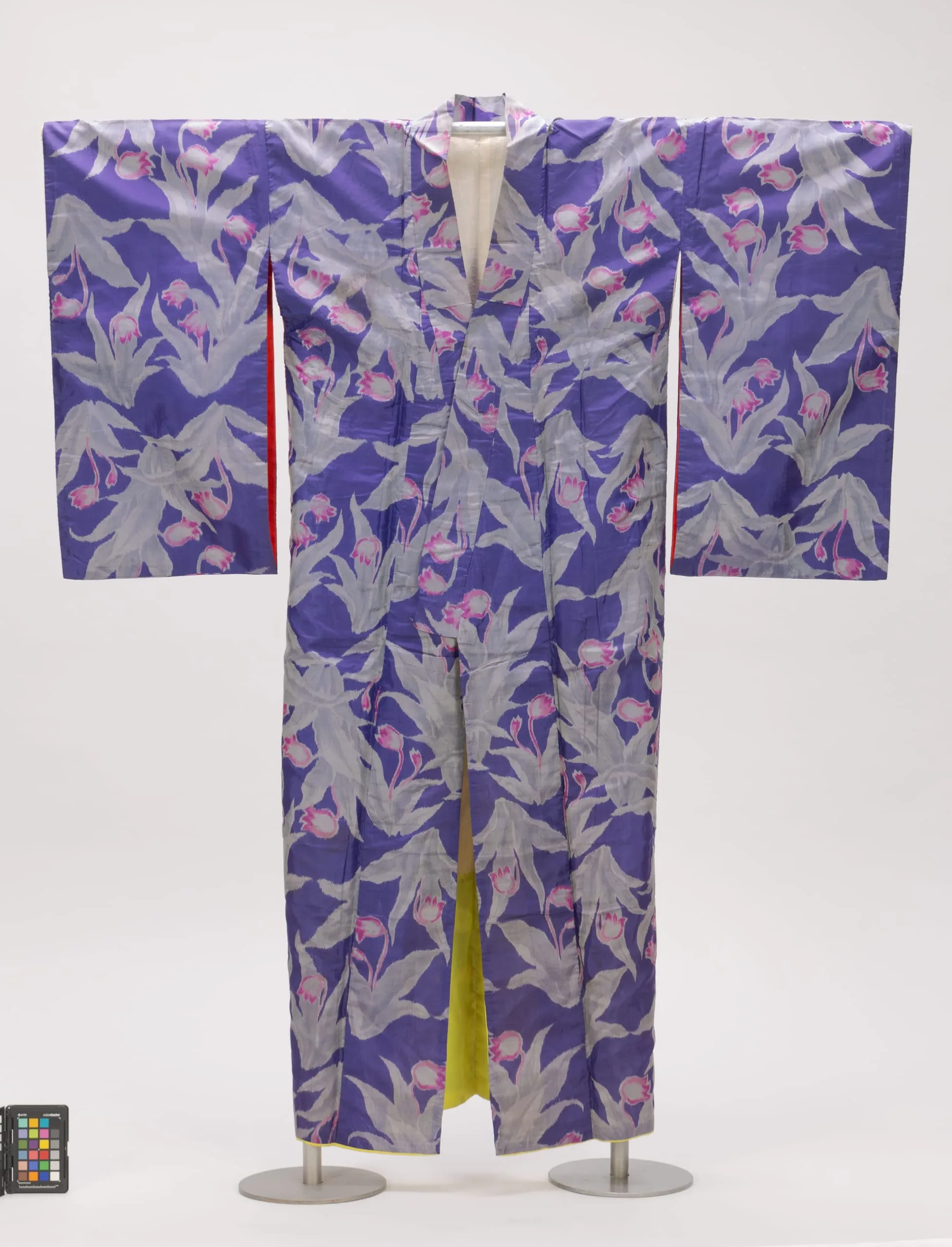 - Silk plain weave with stencil-printed warp ikat (hogushi kasuri meisen)