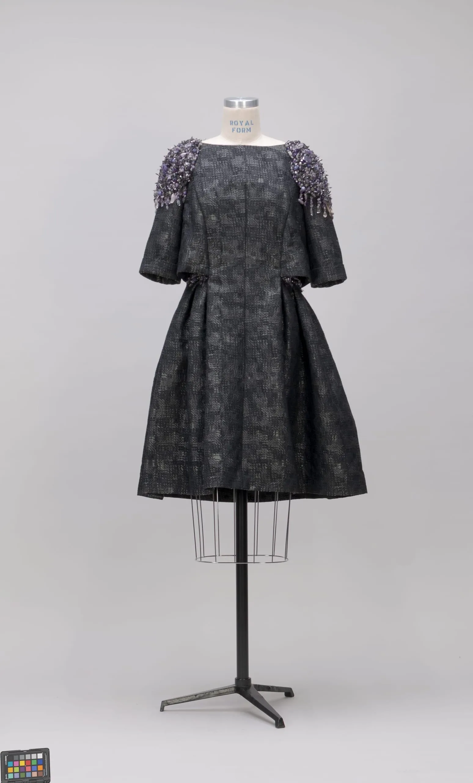 - Wool, polyester, nylon, and acrylic jacquard weave with metal, glass, and stone beads