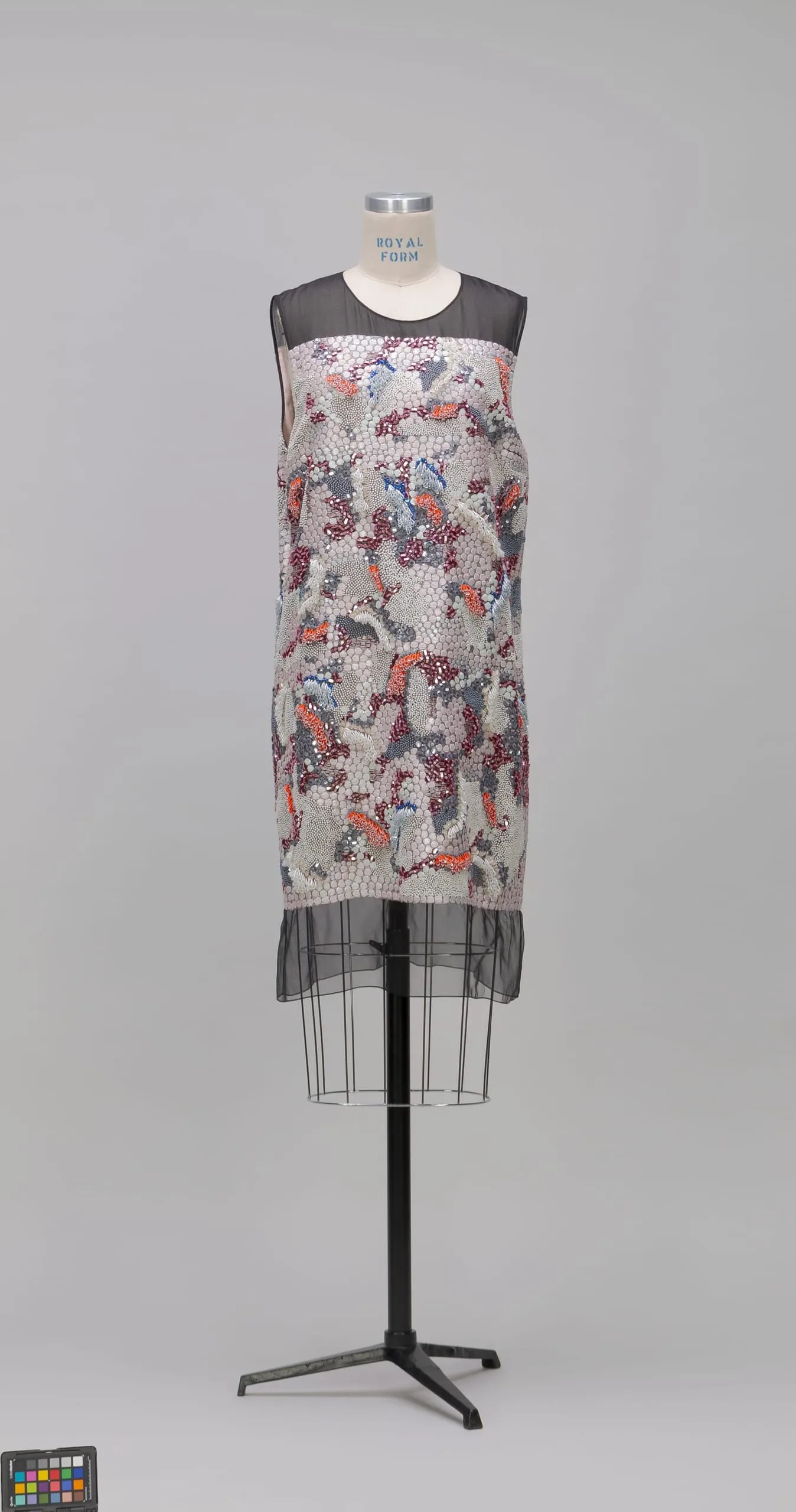 - Dress: Silk plain weave (chiffon) with silk embroidery, plastic sequins, and glass beads; Bag: Silk satin with silk embroidery, plastic sequins, and glass beads