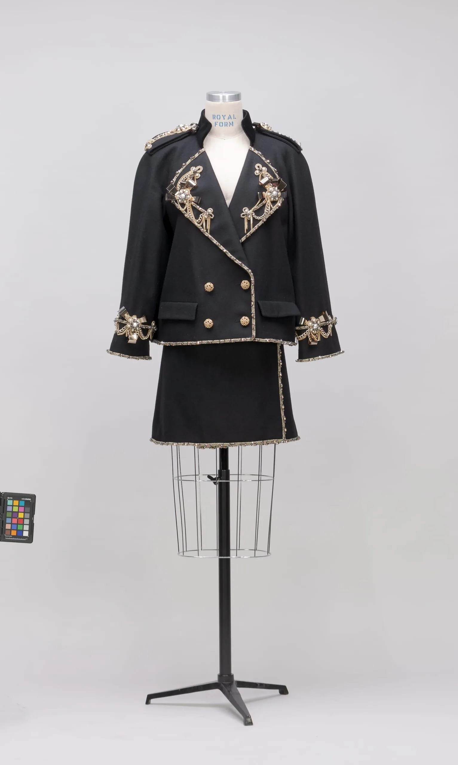 - a) Wool plain weave, full finish, with metallic braid, metal chains, studs, and beads, plastic pearls and bows, and cotton velveteen; b) Wool plain weave, full finish, with metallic braid and metal studs and beads