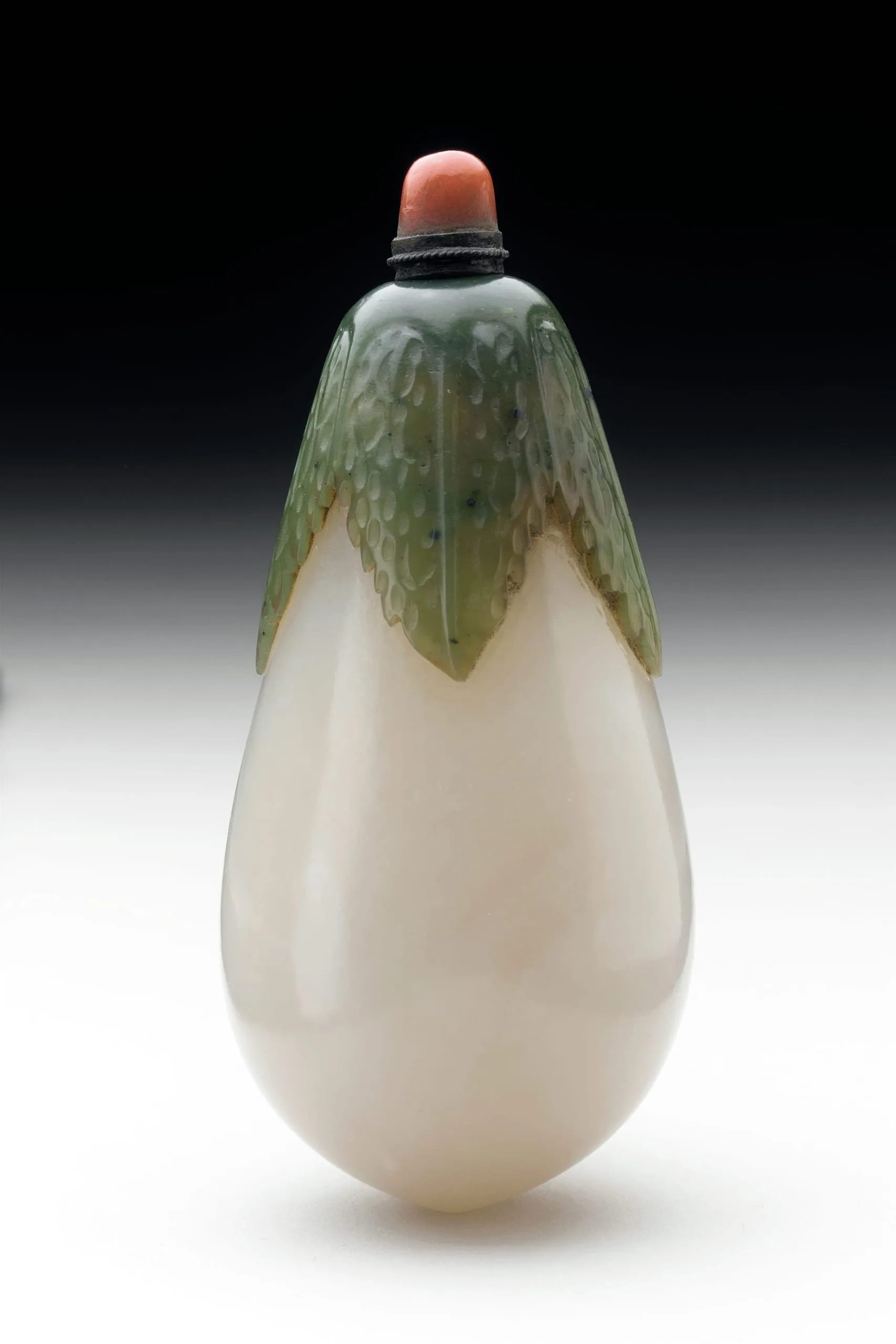 - Abraded jade with carved hardstone overlay, coral mounted metal stopper
