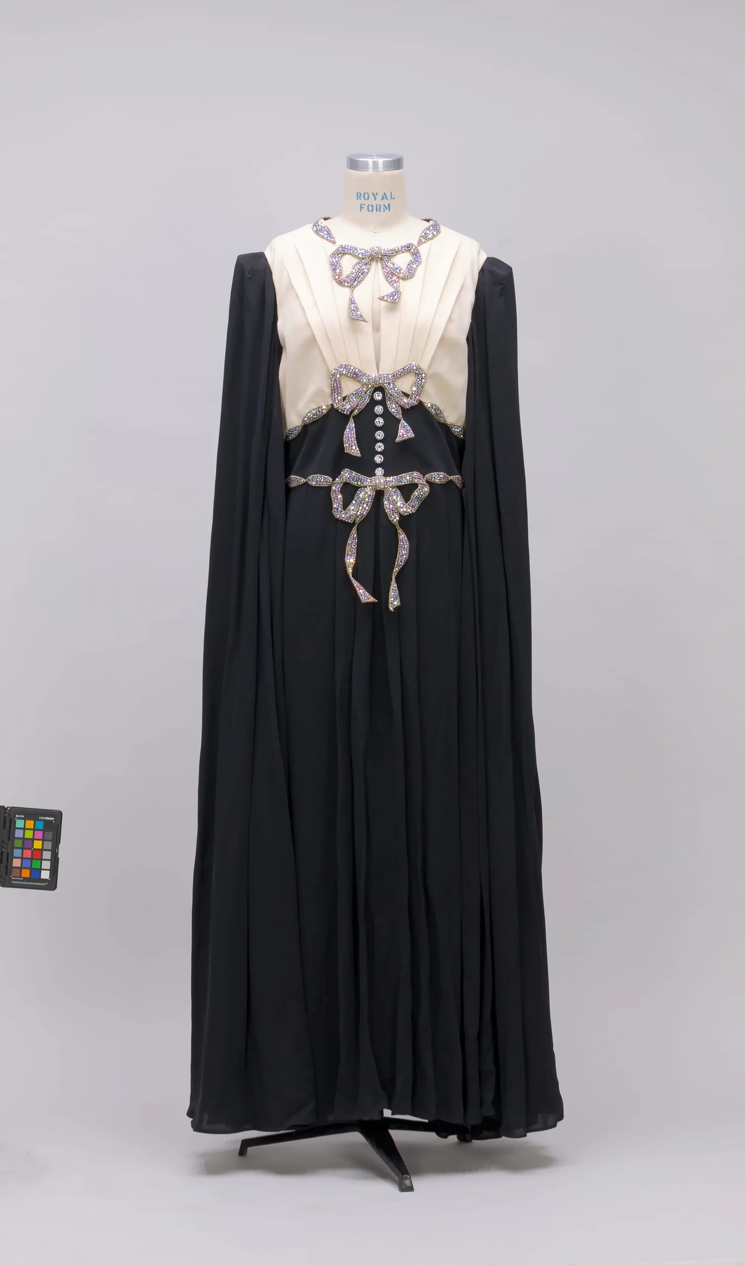 - Viscose/silk plain weave (crepe) with metallic thread and nylon appliqués, crystals, and metal beads