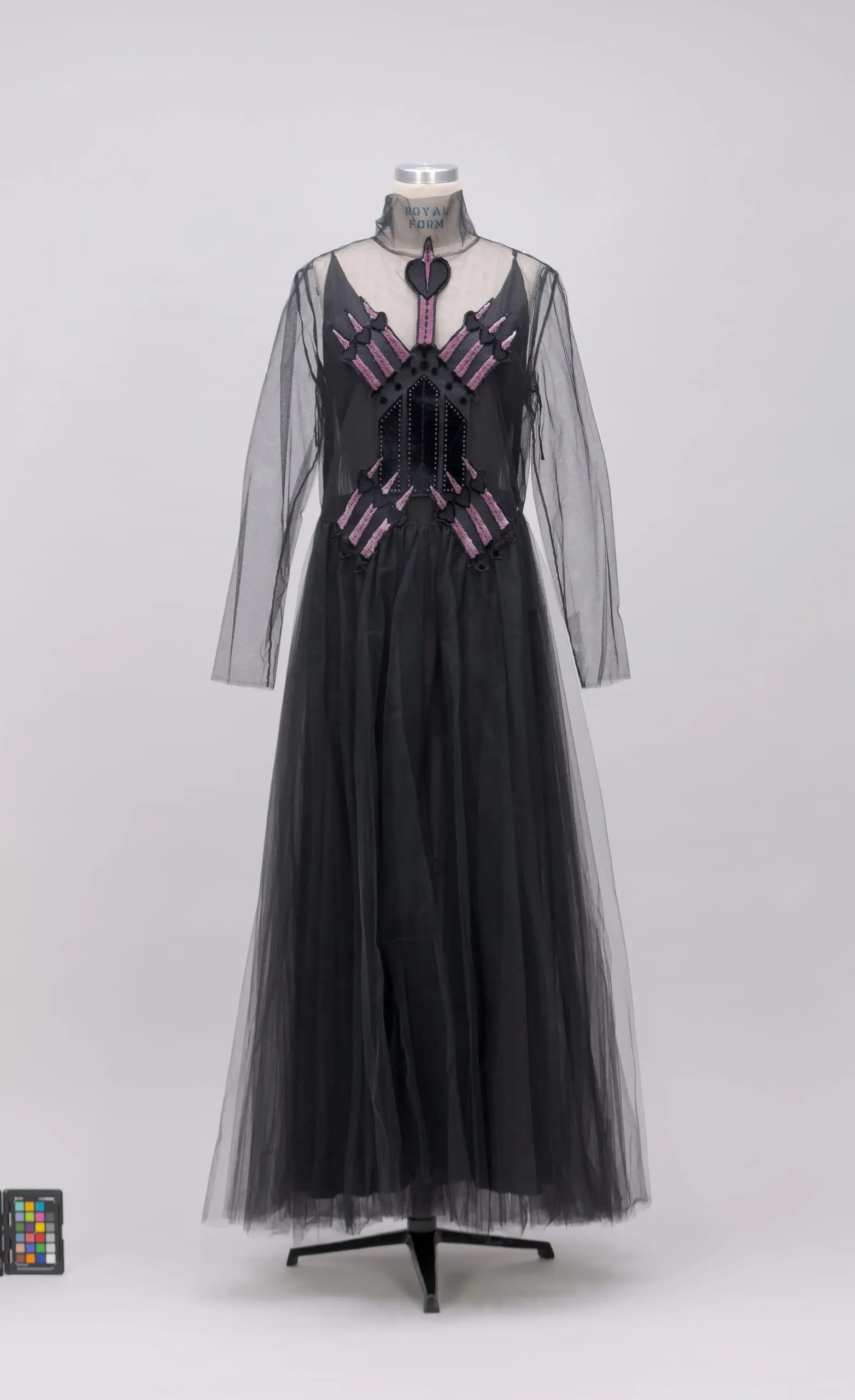 - Dress: Silk net with silk cut, uncut, and voided velvet appliqué, and silk and elastic plain weave (crepe); Slip: Silk plain weave; Compact: Metal and enameled metal with crystals