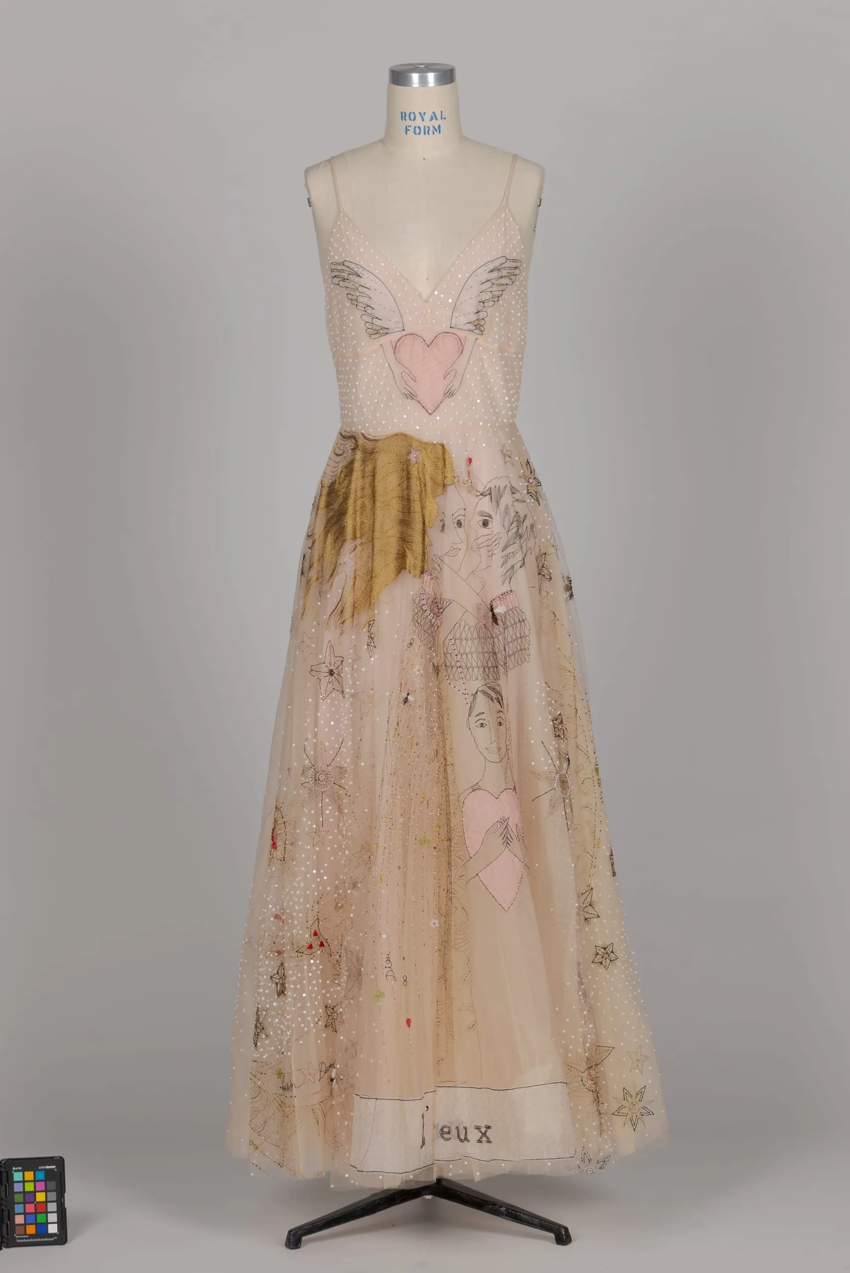 - Polyamide net with silk, rayon, and metallic thread embroidery with glass beads and plastic (polyvinyl chloride) sequins