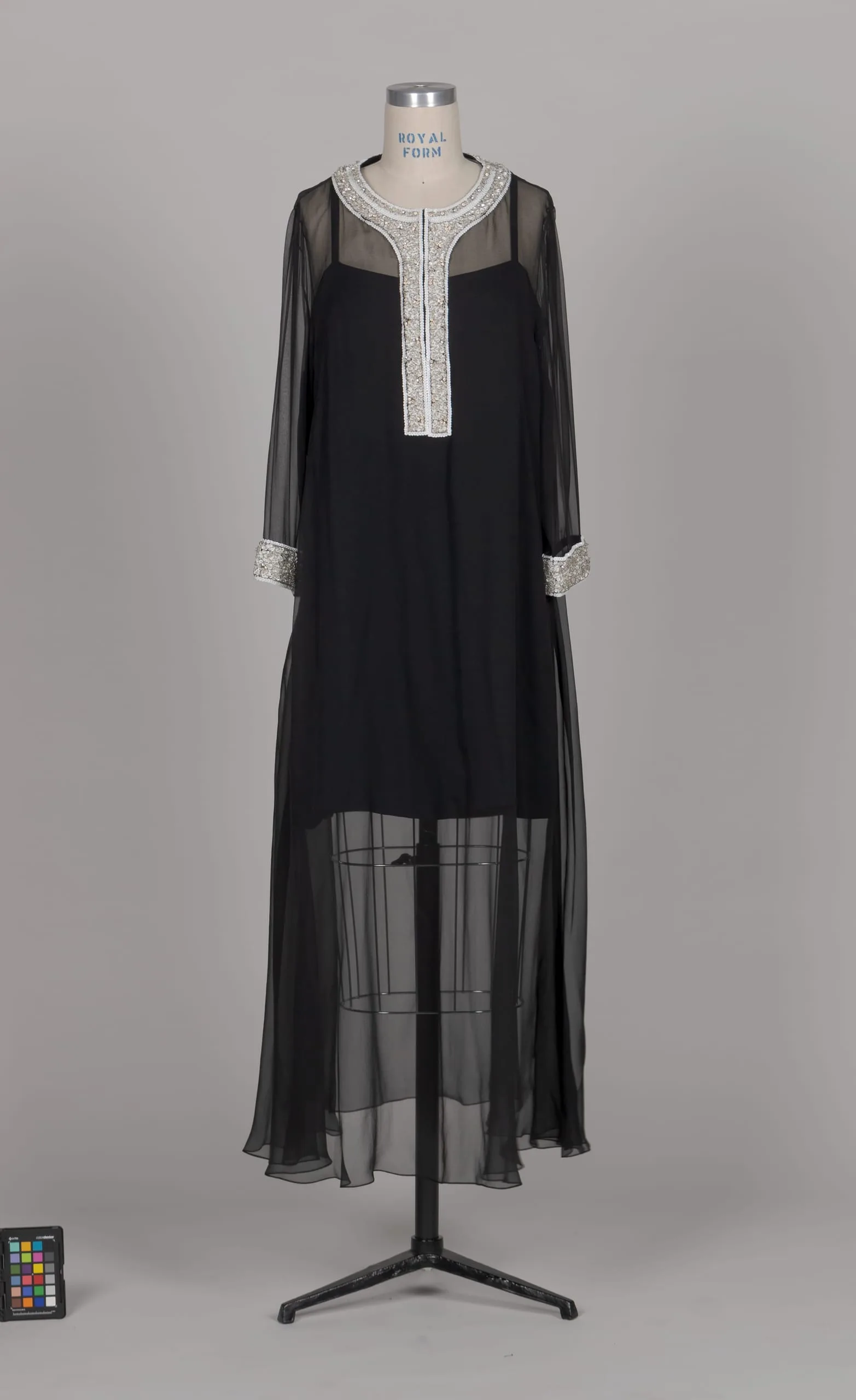 - Silk plain weave (crepe) with glass beads, plastic sequins, and crystals