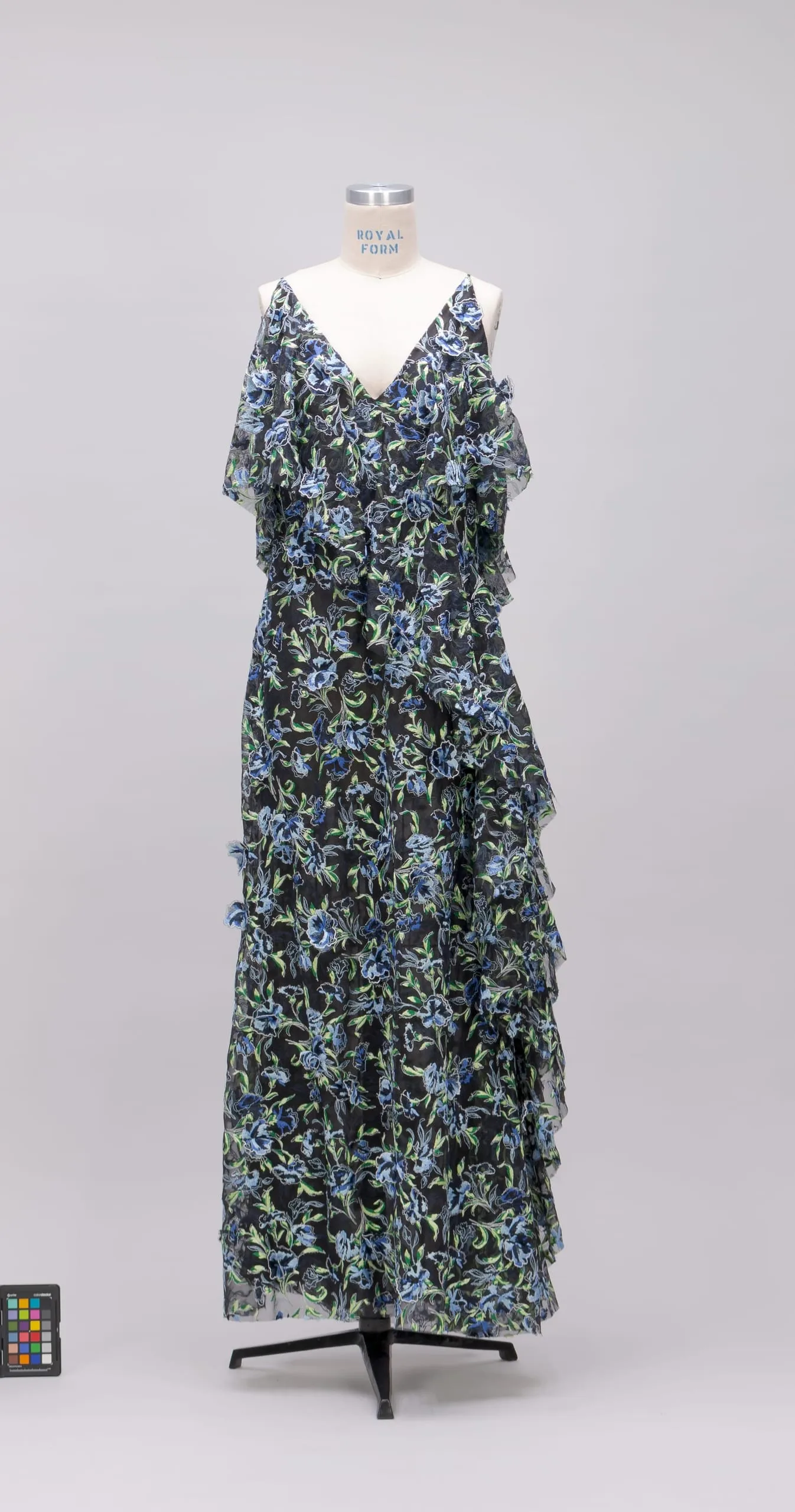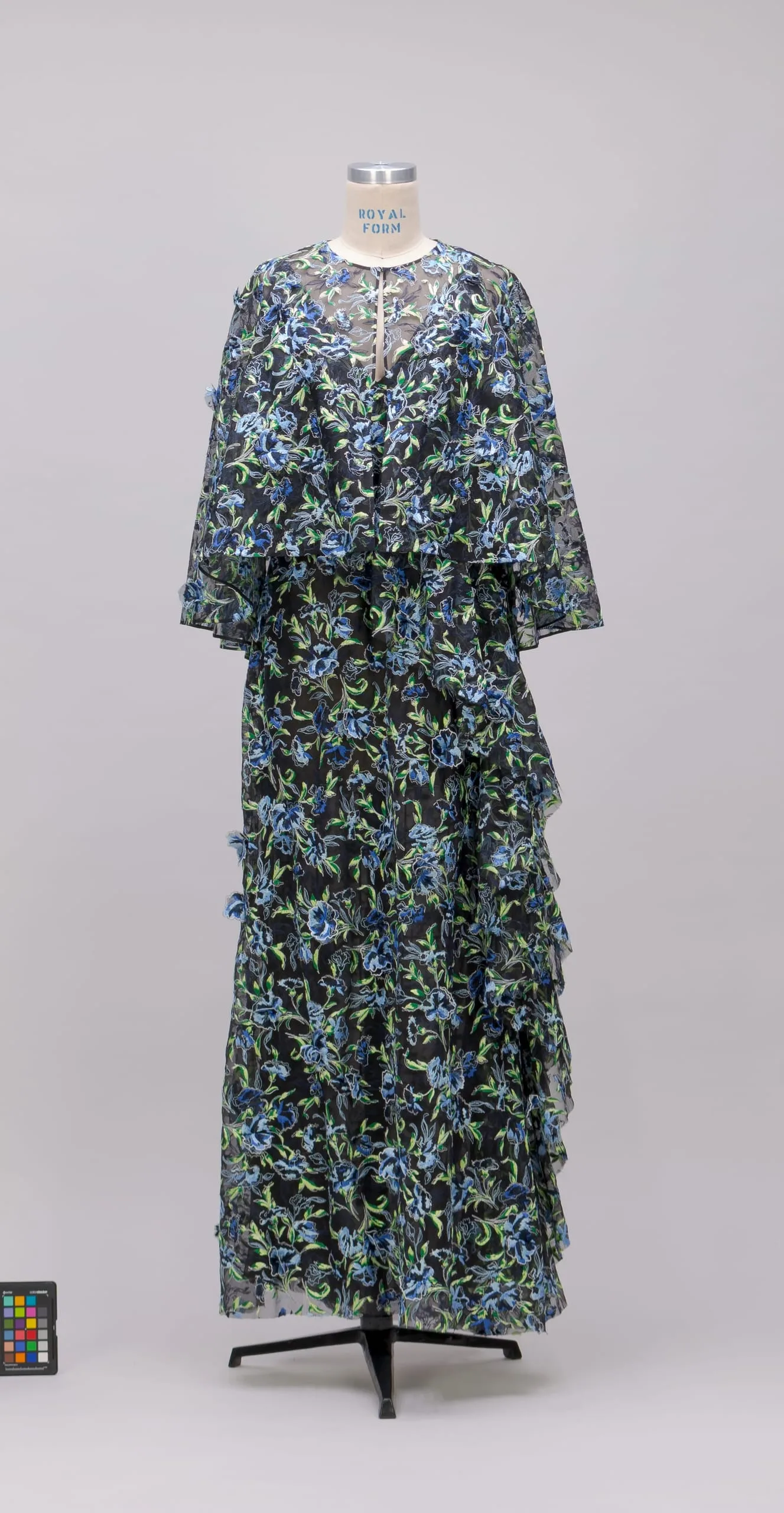 - Polyester plain weave (organza) with polyester, silk, and cotton embroidery