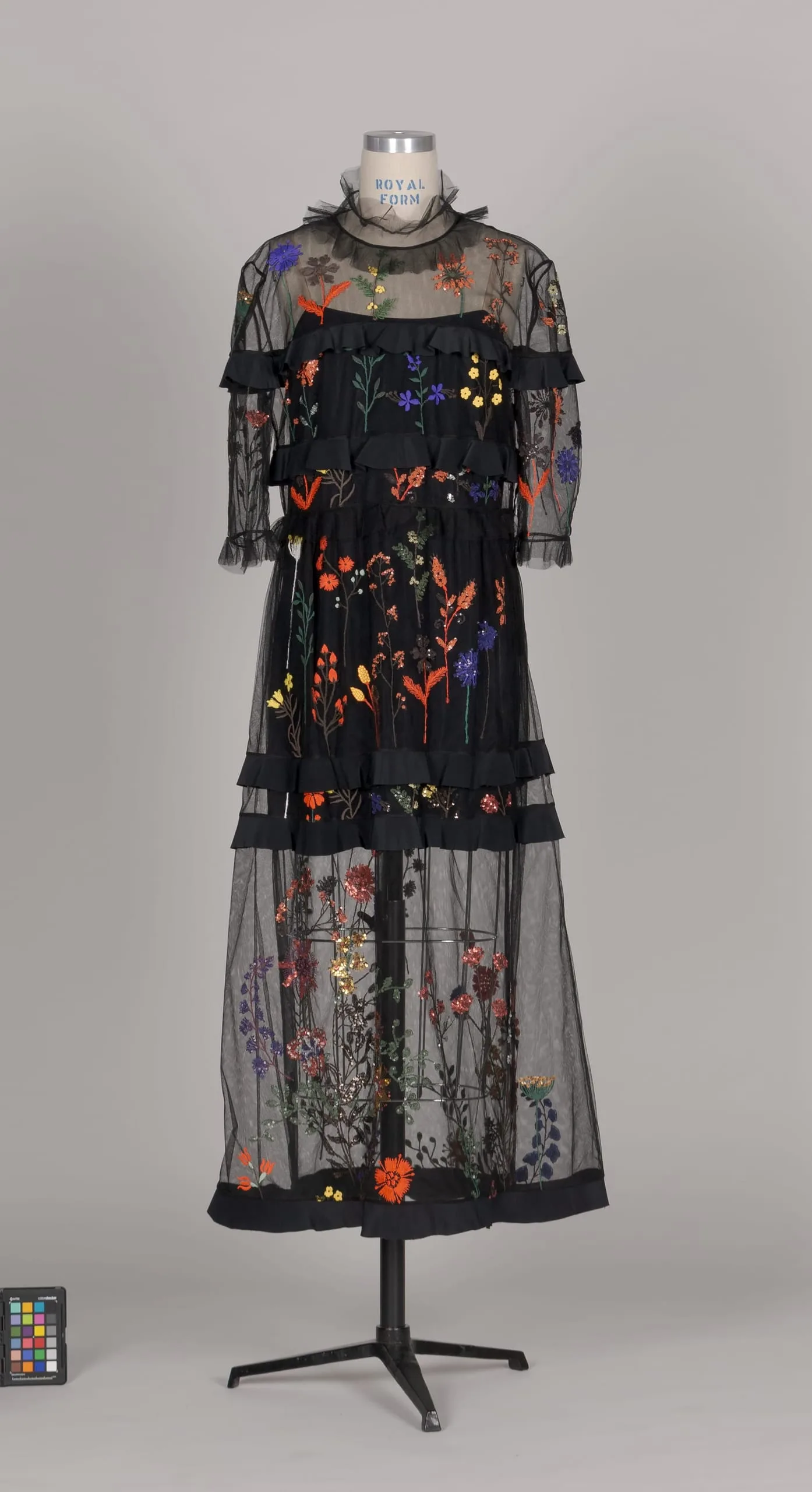 - Dress: Silk net, polyester plain weave (faille) with cotton embroidery and plastic sequins; Slip: Polyester/elastane knit; Bag: Cotton plush with leather and metal