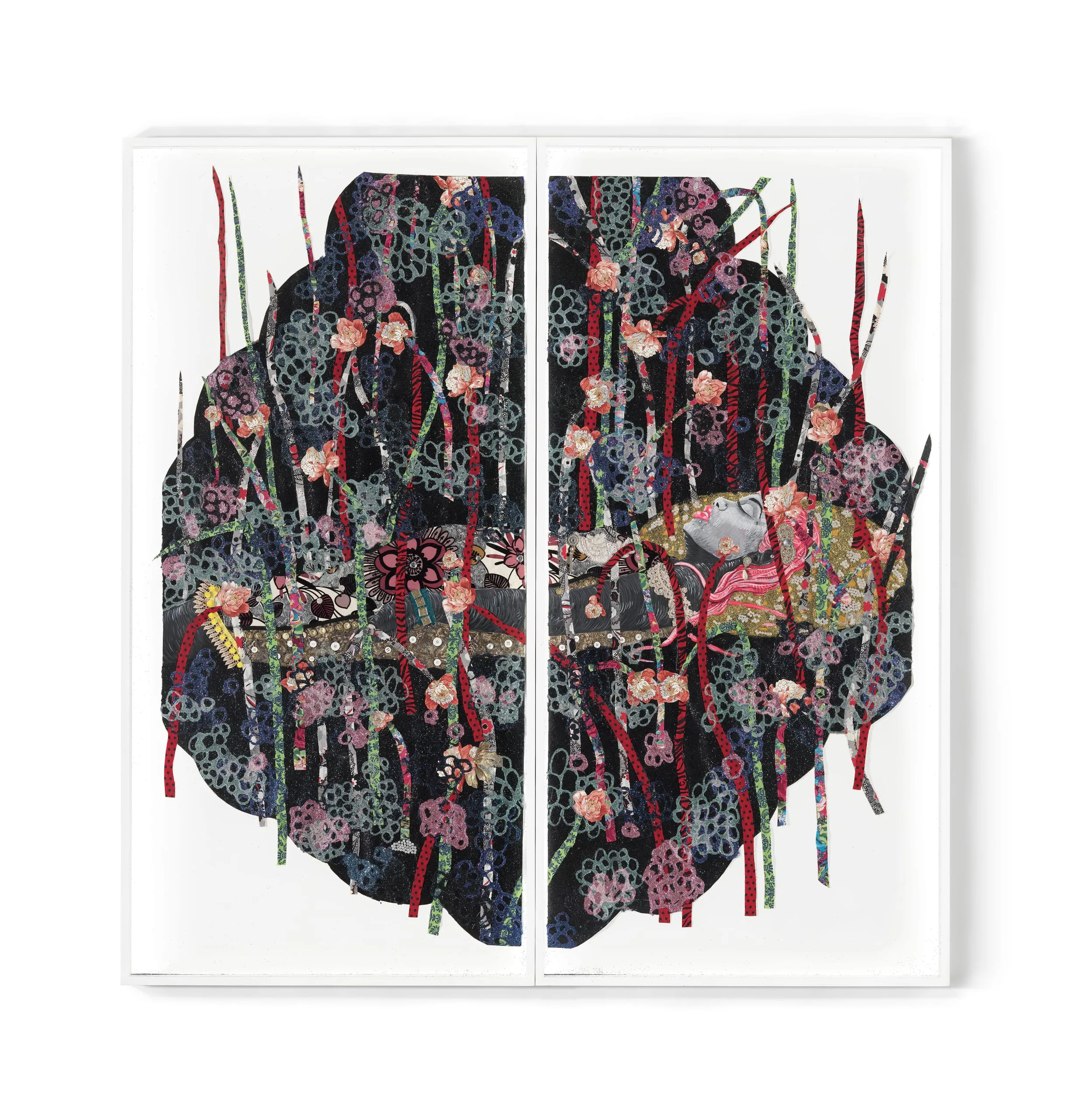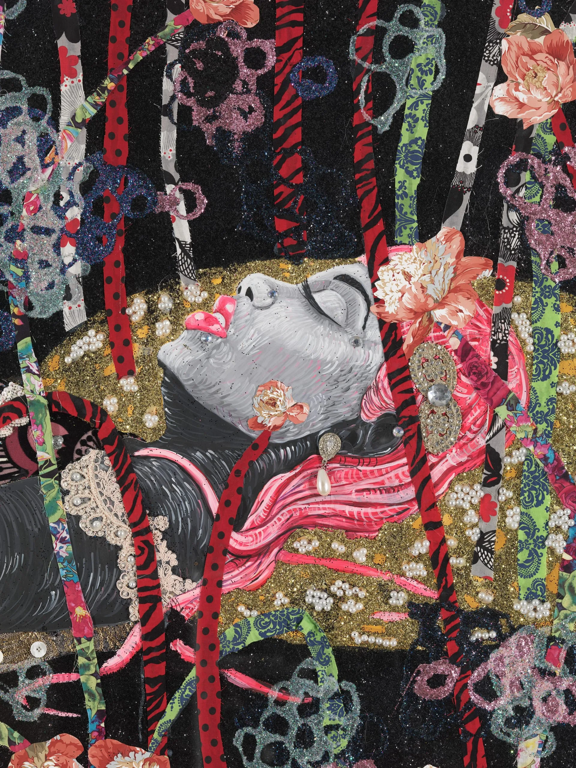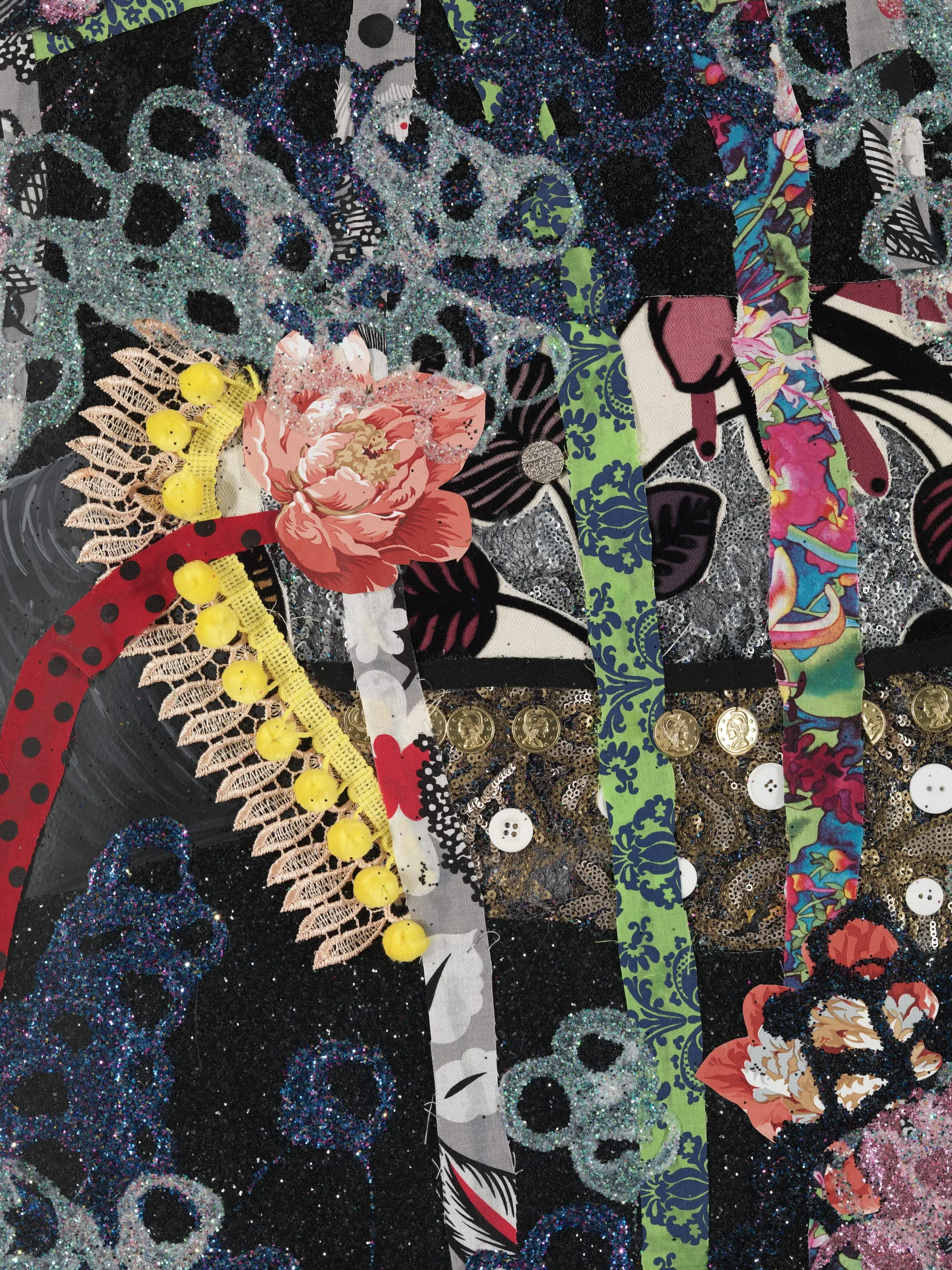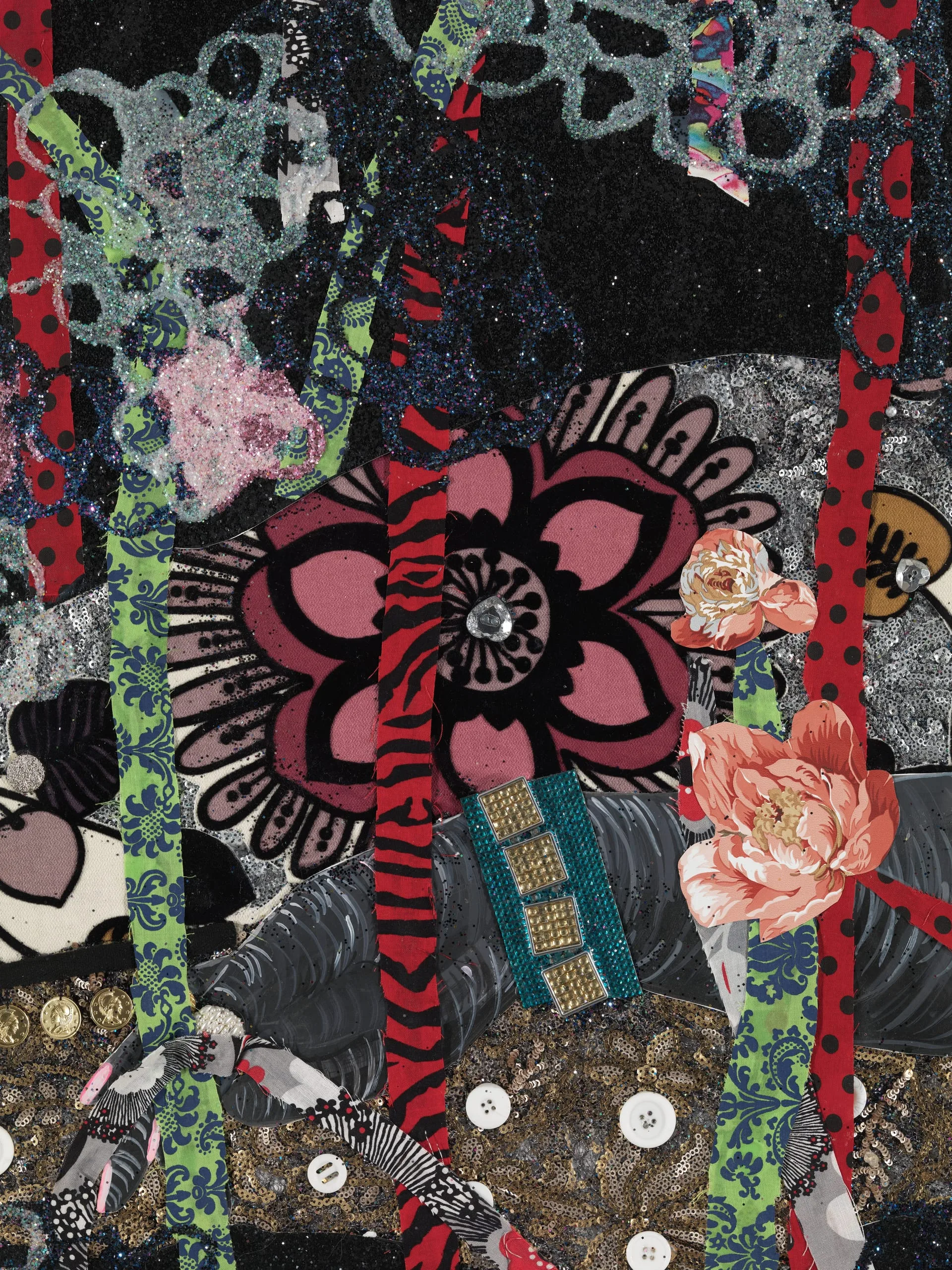 - Beads, appliques, fabric, glitter, buttons, costume jewelry, plastic letters, feathered butterflies and glue on digital print on hand cut watercolor paper