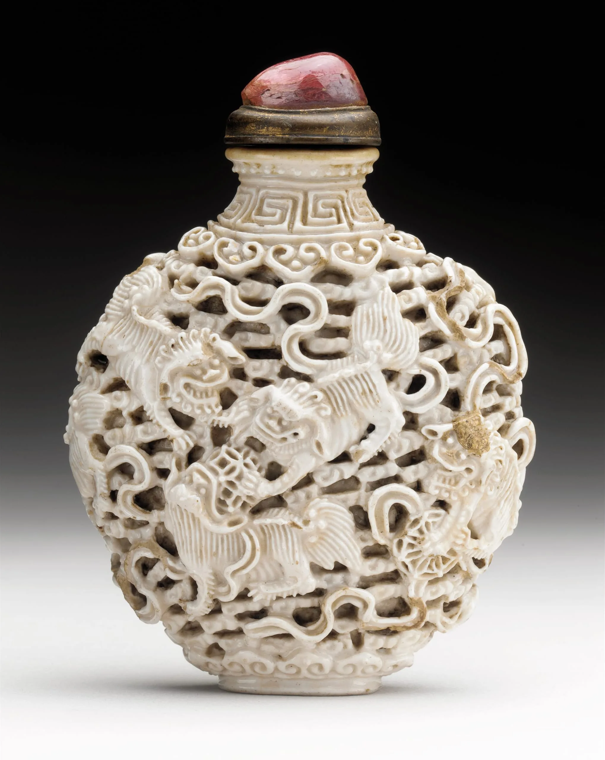 - Molded soft-paste porcelain with reticulated design, with rose quartz mounted stopper